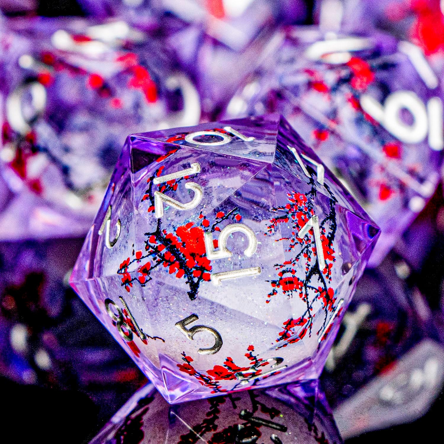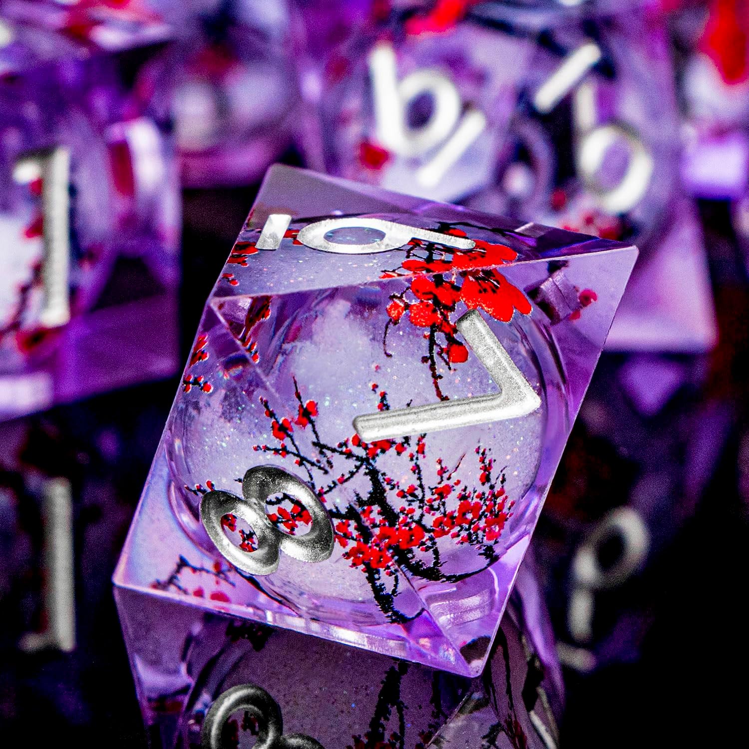 Plum Blossom DND Dice Purple Liquid Core Dice Set with Metal Box, Handmade Sharp Edge Dice D and D Polyhedral Dice for use with D&D RPG Role Playing Game