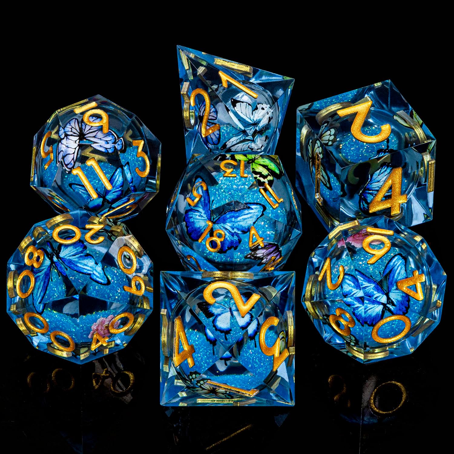Butterfly DND Dice Blue Liquid Core Dice Set with Metal Box, Handmade Sharp Edge D and D Polyhedral Dice for use with D&D Role Playing Game, D20 D12 D10 D8 D6
