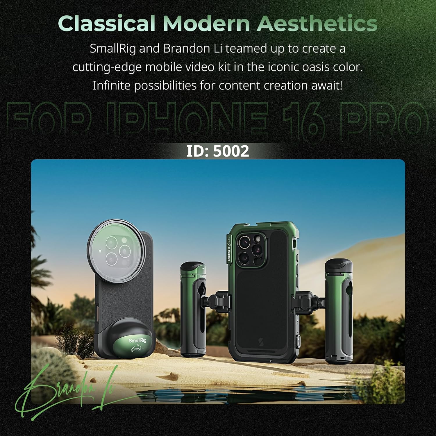 - Mobile Video Kit Co-design Edition - SmallRig x Brandon Li mobile video kit 5002 is specially designed for iPhone 16 Pro, helping to achieve professional-level mobile phone video recording, live broadcasting and micro-film shooting. The kit includes a mobile phone case(only for iPhone 16 Pro ), a phone video cage, a capture grip, a rotatable handle with wireless control, a rotatable side handle, a TUP soft frame, FilMov 67mm magnetic filter adapter, and a 67mm 1-9 stop VND magnetic filter