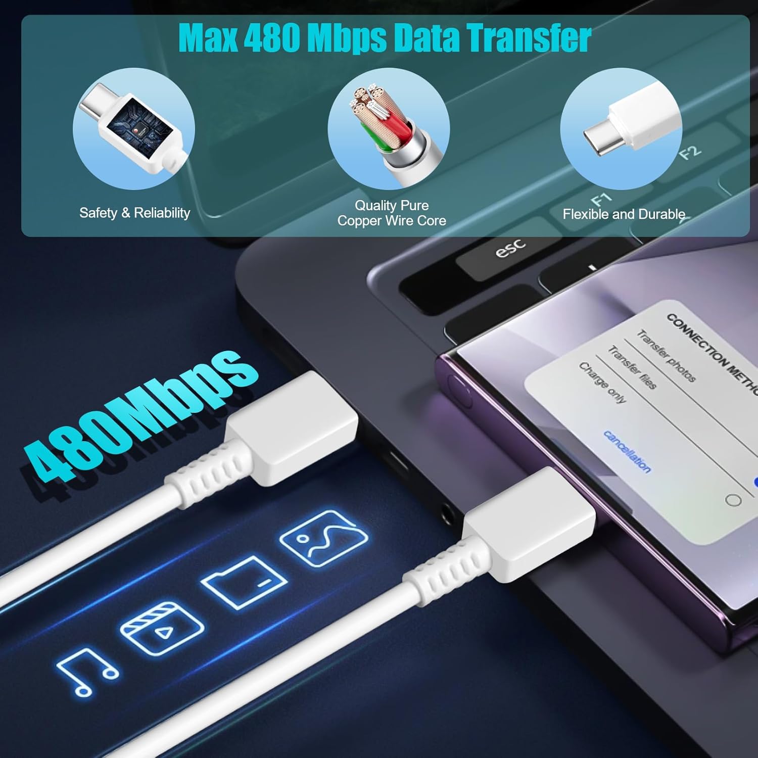 - 【10FT Long Samsung S25 ultra Charger Fast Charging Cable】The USB C Samsung Charger Fast Charging Block kit Comes With a 60W Detachable USB Type C to USB Type C Charger Cable Cord,Super Charger With Max 5A Current for Your Phone From any other USB Type-C Power.Use the Cable to Sync and Transfer Files at Blazing Speeds With Your Galaxy Phones or any other Compatible Smartphone or Laptop.