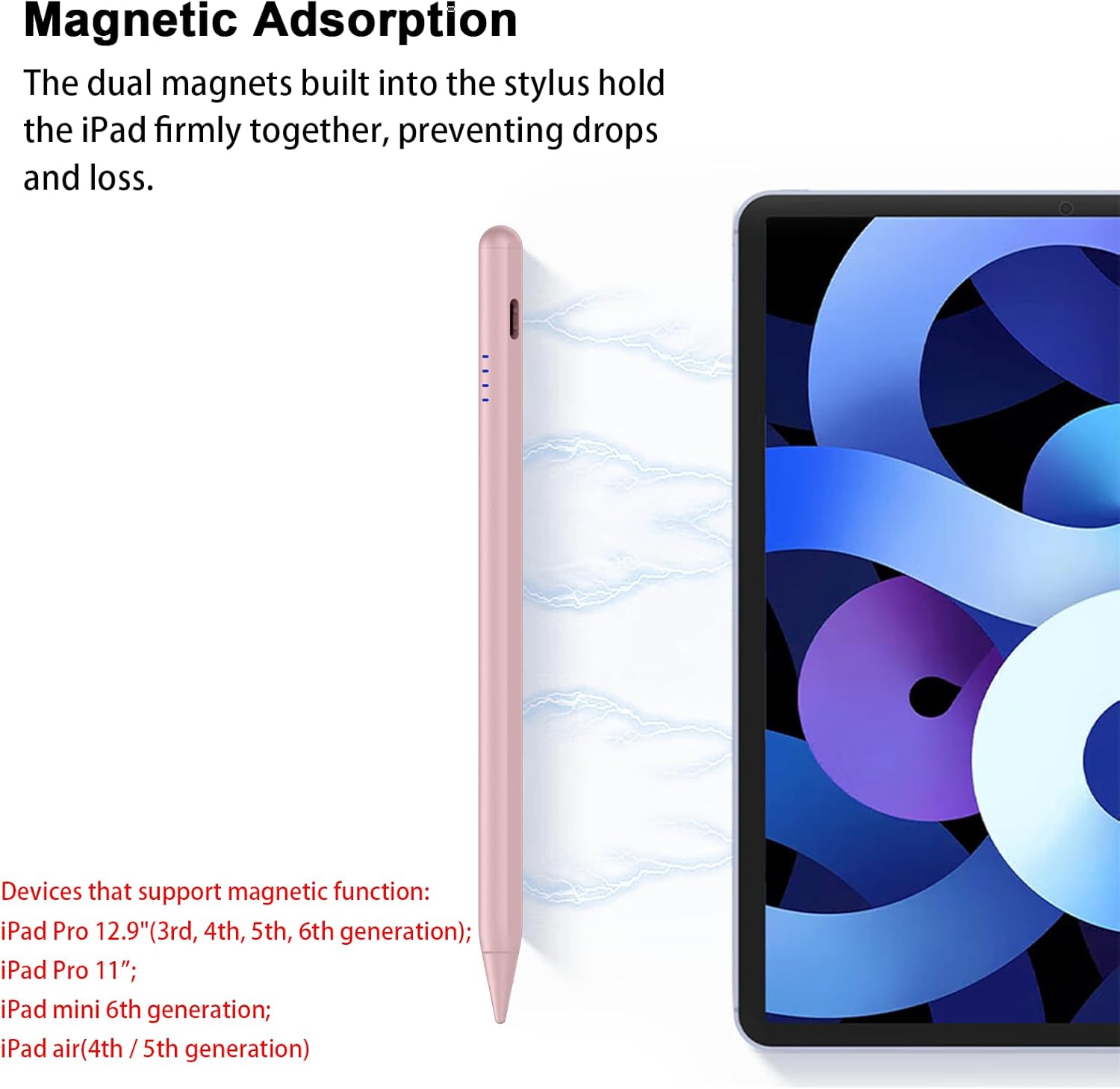 - ăPalm Rejection / Magnetic Functionă The stylus pen for ipad has Palm Rejection function, no need to wear gloves when writing, you can rest assured that your hand on the screen drawing, for your fine writing Drawing convenience. This iPad Tablet Pen is also built-in two magnets, which can be attached to the side of iPad Pro 11-inch (1/2/3 Gen), iPad Pro 12.9-inch (3/4/5 Gen), iPad Air (4/5 Gen), and iPad mini 6, so it never scrolls away. (Note: This stylus pen does not support wireless charging)