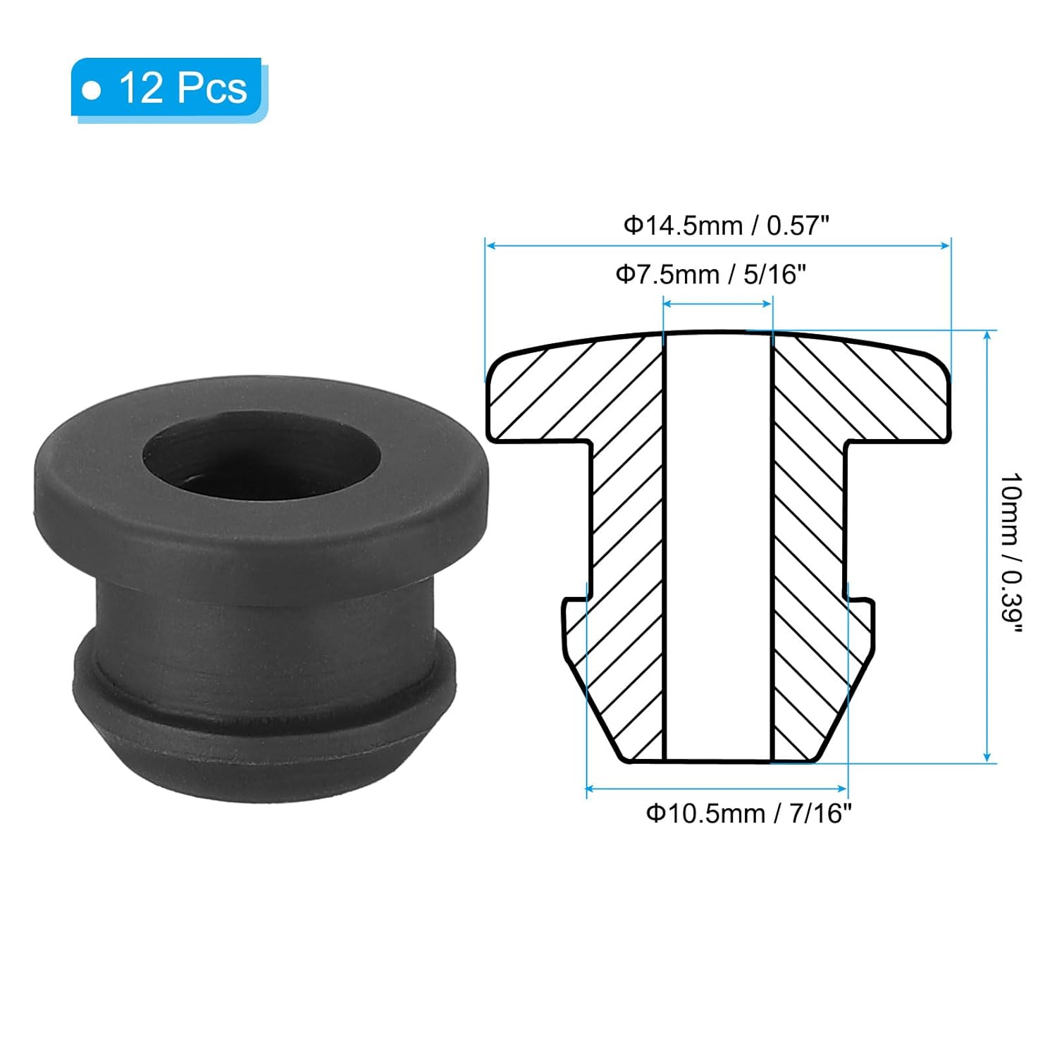 - Color: Black; Material: Silicone Rubber; Drill Hole: 10.5mm / 7/16 Inch; Inside Diameter: 7.5mm / 5/16 Inch; Outside Diameter: 14.5mm / 0.57 Inch; Overall Thickness: 10mm / 0.39 Inch; Packing List: 12 x Rubber Grommets