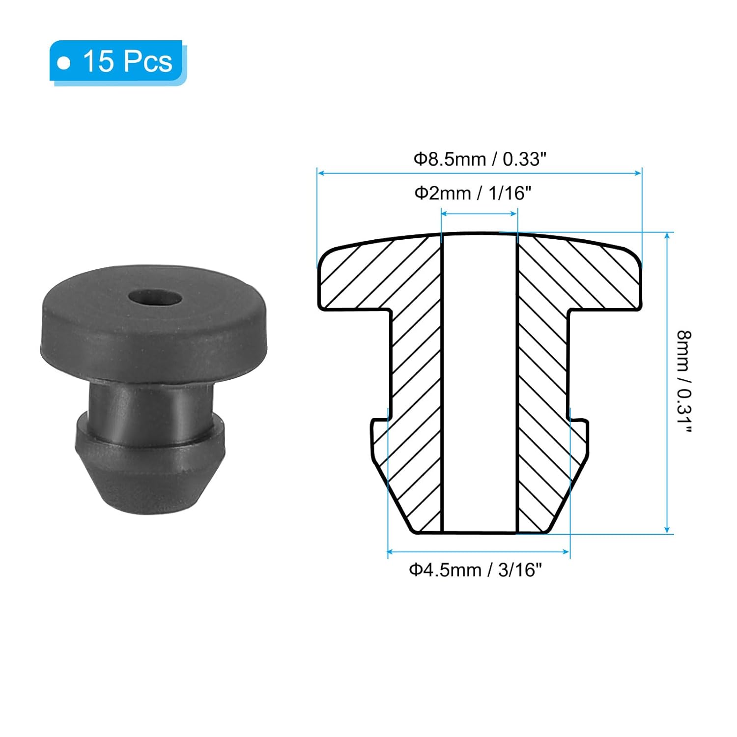 - Color: Black; Material: Silicone Rubber; Drill Hole: 4.5mm / 3/16 Inch; Inside Diameter: 2mm / 1/16 Inch; Outside Diameter: 8.5mm / 0.33 Inch; Overall Thickness: 8mm / 0.31 Inch; Packing List: 15 x Rubber Grommets