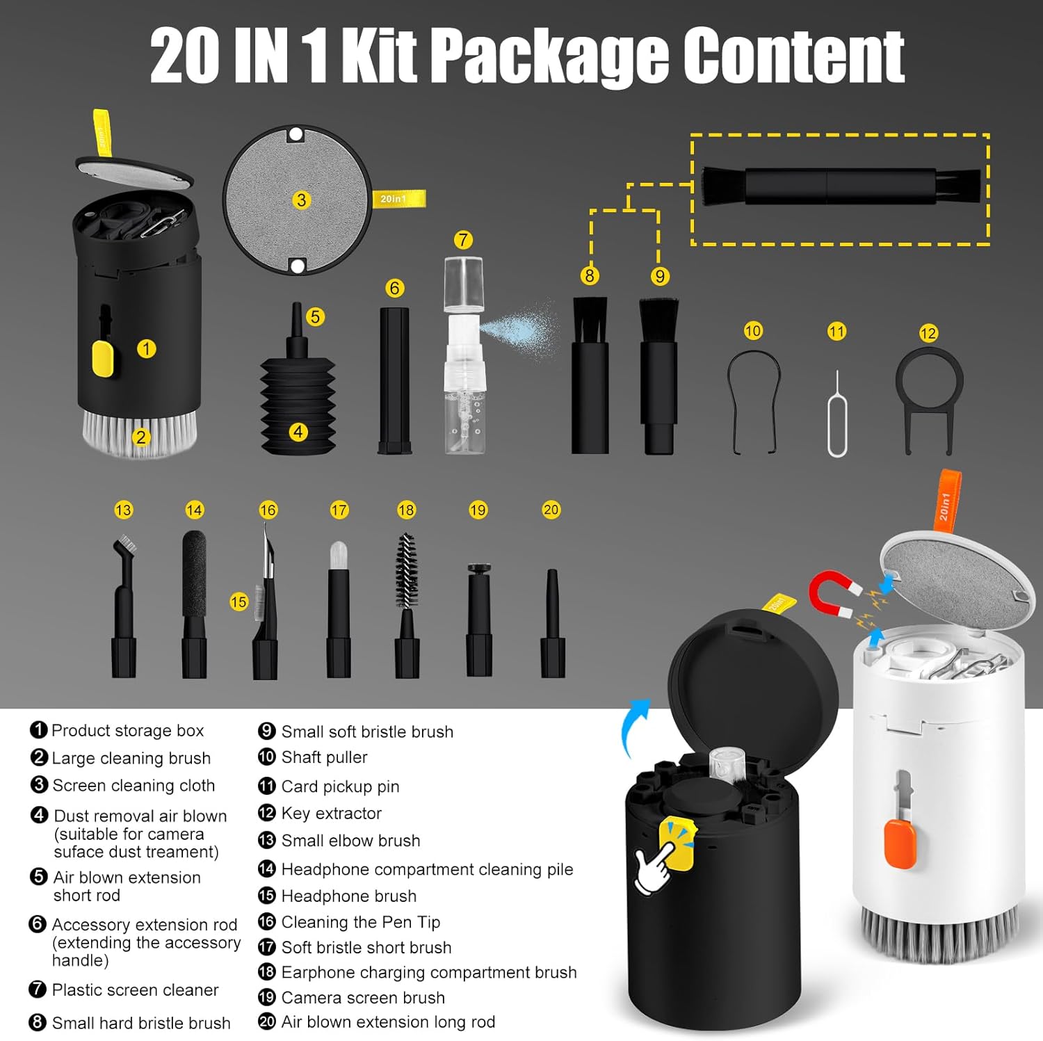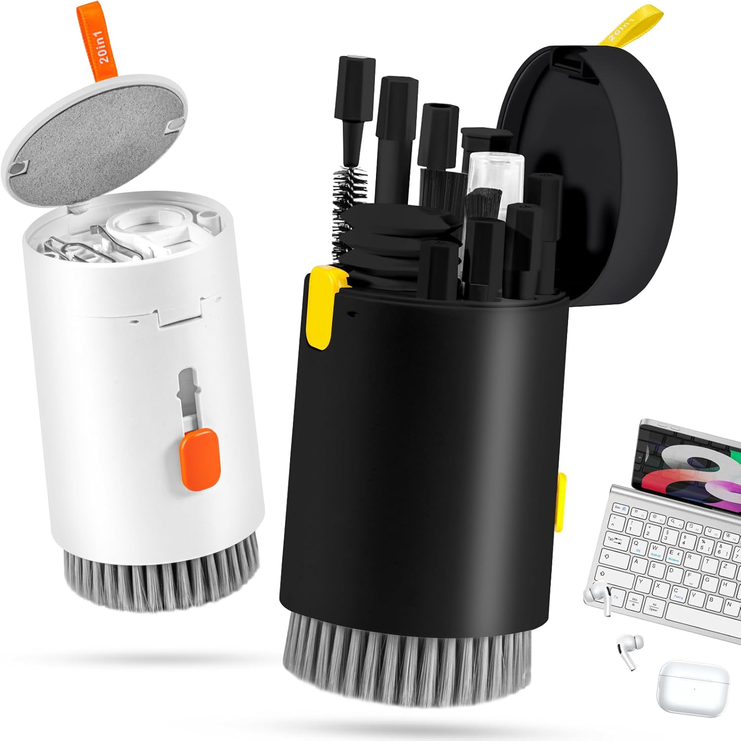 - 2 Pack 20 in 1 Keyboard Screen Cleaner Kit: One of computer cleaning kit includes an Airpod cleaner pen, flocking sponge, mini soft brush, len brush, earphone case cleaning brush, and camera brush (All these brushes with the help of an extension rod which could use easier), screen cleaner spray, microfiber fiber cloth of the lid, retractable keyboard brush, keycap puller, shaft puller, air blower with 2 rods for extending, dual head brush (hard and soft bristle brush), card pickup pin.