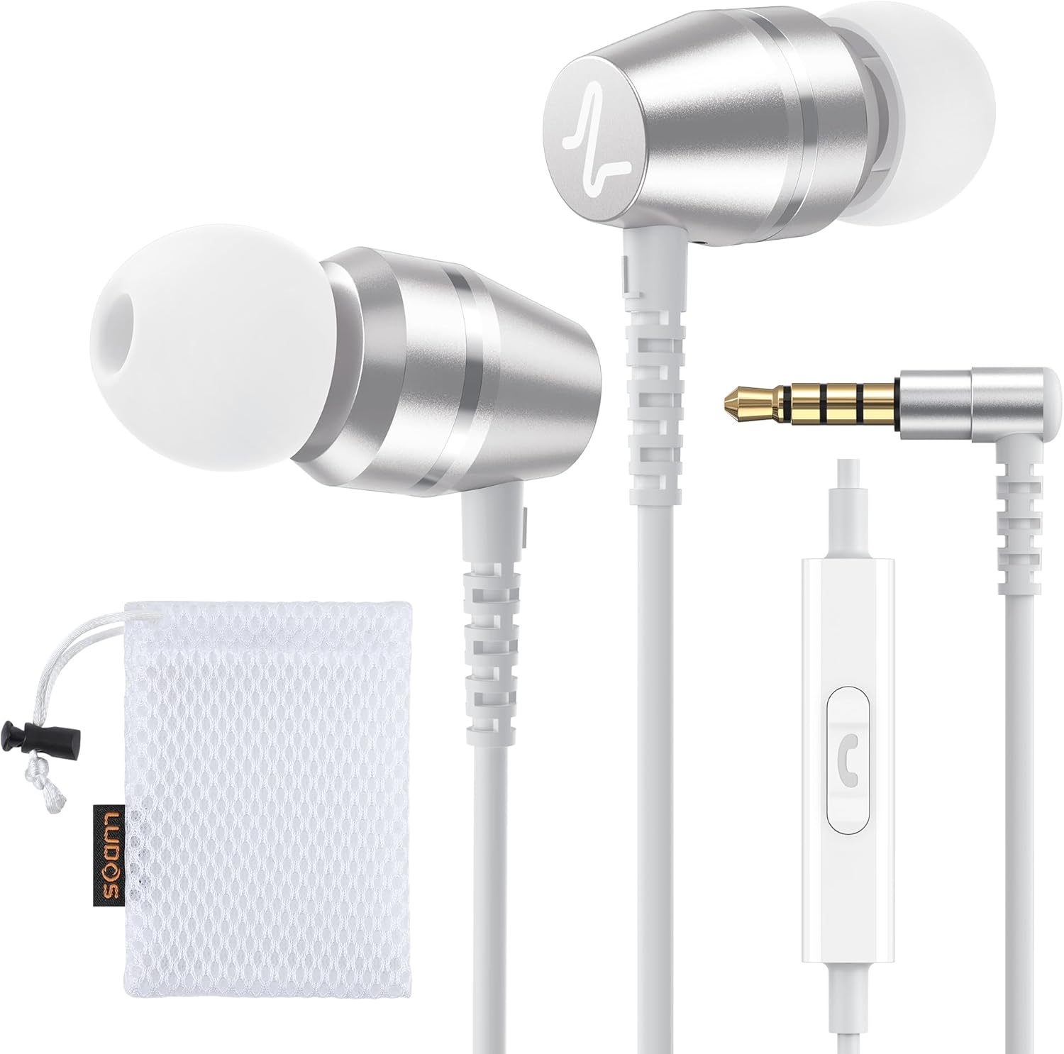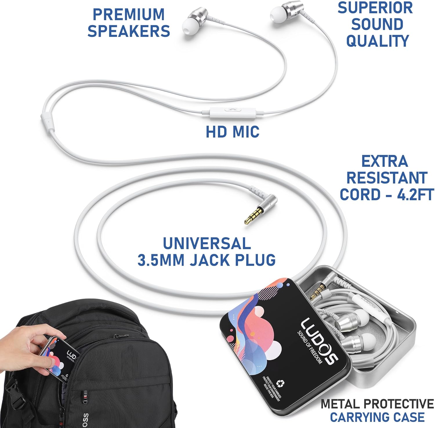 LUDOS OMNITONE Wired Earbuds in-Ear Headphones, 5 Years Warranty, Earphones with Microphone, 3.5 mm Jack Corded Ear Buds, Videoconference for iPhone, Samsung, Laptop, Kids, School Students - White