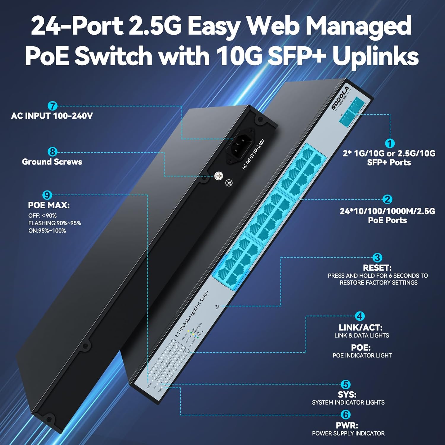 - 【2.5G&10G PoESwitch】The 24-Port 2.5Gb Switch PoE features with 24X2.5G PoE ports + 2X10G SFP+ ports for lightning-fast 2.5Gb network connectivity.Pro Tip for 2.5GbE Speeds:Use Cat6+ pure copper cables (avoid CCA/copper-clad aluminum) and ensure all devices (router, NICs, etc.) support 2.5GbE-otherwise, your network speed will default to the slowest connected device.
