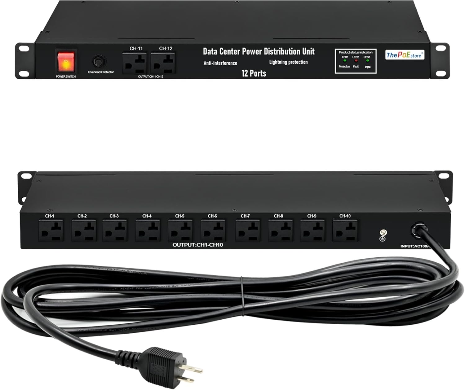 - Application: Output: 12 NEMA 5-15R outlets (2 front and 10 rear); Input: 1 NEMA 5-15P US straight plug, w/1 12AWG 16 ft power cord;3 LED indicators: Let users know electronics are powered and turn on protection and fault indication