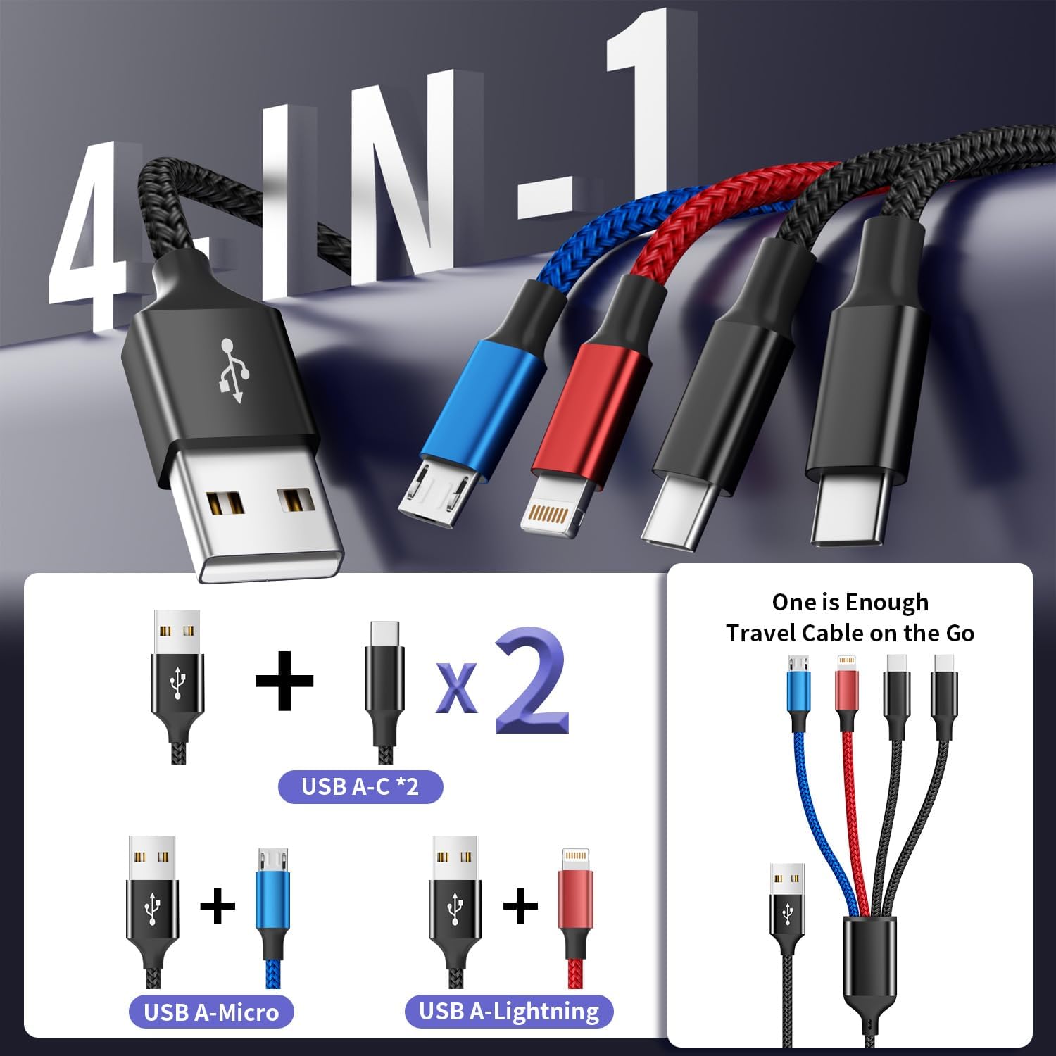 - ăWhat You Getă2Packs 5Ft Nylon Braided dual type-C port 4-in-1 usb multi charging cable, the 5-feet length is just right for travel or bedside charging, saving you from carrying multi chargers. Any issue will be replied within 12 hours. Plus, choose our multi charger cable as travel/ vacation/ camping gifts, or must have items for your family, friends, they will be filled the convenience and warmth throughout the year.