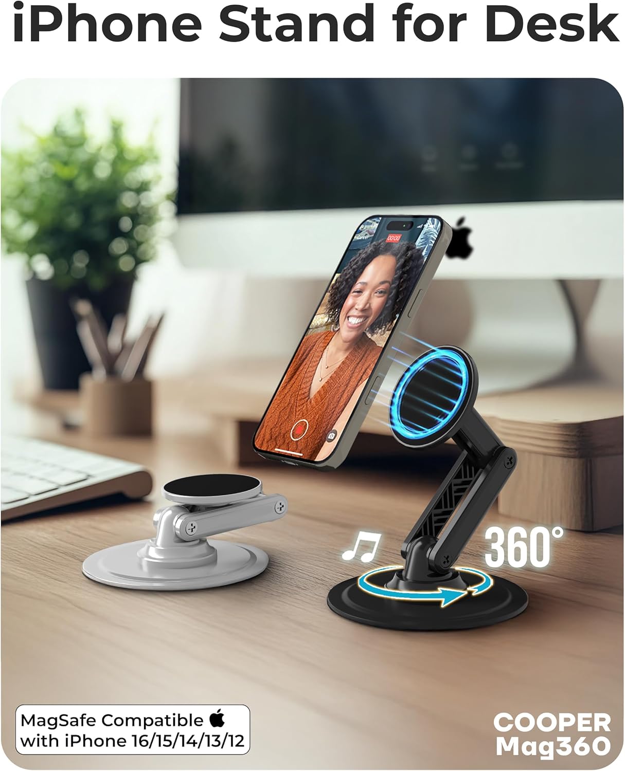 COOPER Magnetic Phone Stand for Desk, Mag360 Adjustable MagSafe Stand for iPhone 16 Pro Max, 15 14 13 12 & Plus | 360° MagSafe Phone Holder, Strong Magnetic Mag Safe, Foldable 3-Axis Leg (Black)