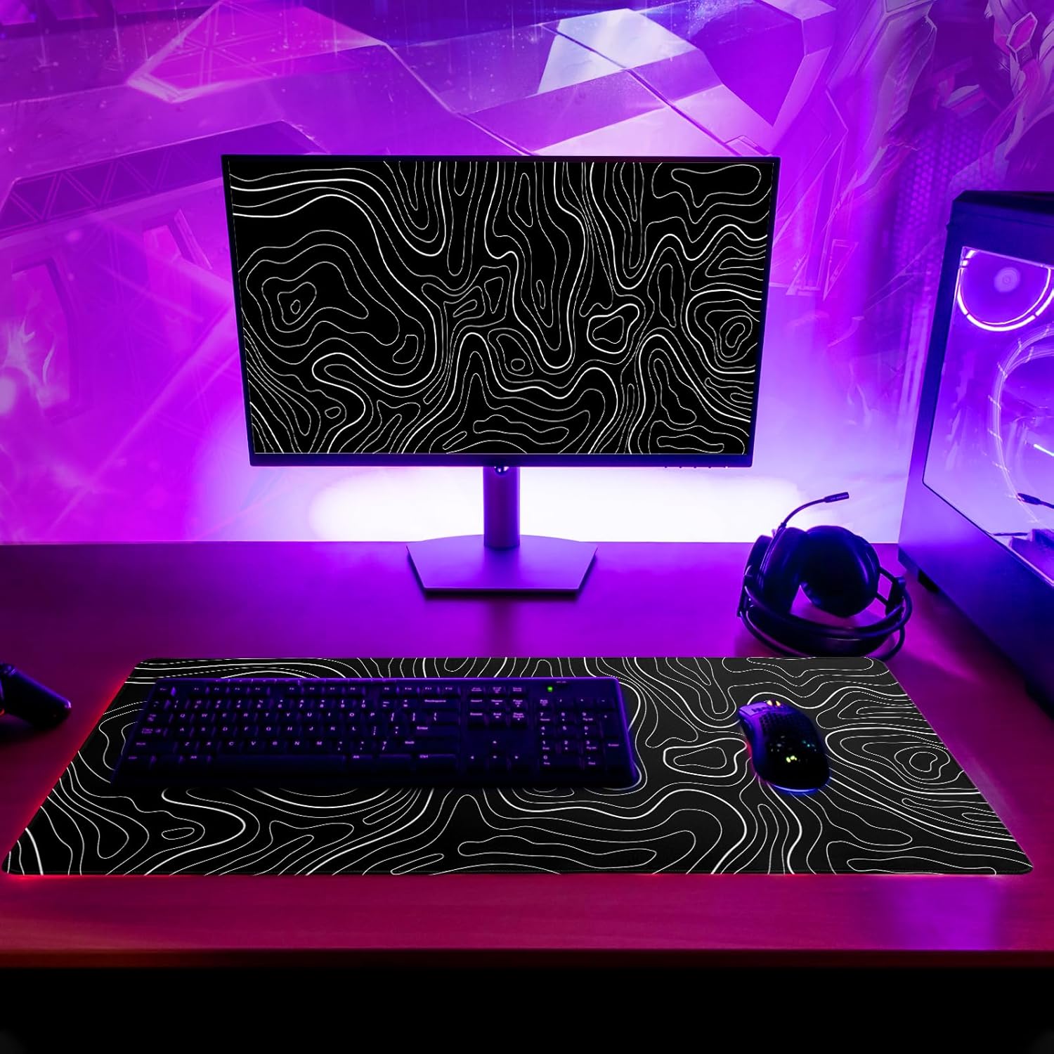 - ♥[Extended Mouse Pad Size]:The extended Black Topographic Contour desk pad measures 31.5x11.8x0.12 inches that covers most of the desk. Offers a wide area to have your laptop, mouse and keyboard. You can freely move your mouse without any interruption and don't have to continually adjust the mat as you do with traditional mousepads.