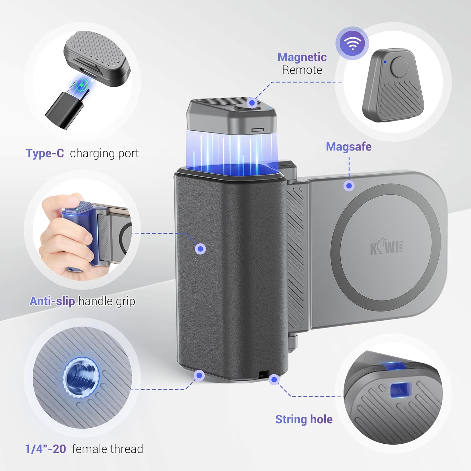 KIWIFOTOS for Magsafe Phone Camera Grip Magnetic Phone Tripod Handle with Bluetooth Remote & Tripod Mount Adapter for iPhone 16 Pro Max Samsung Smartphone Vlog Video Shooting (Gray)