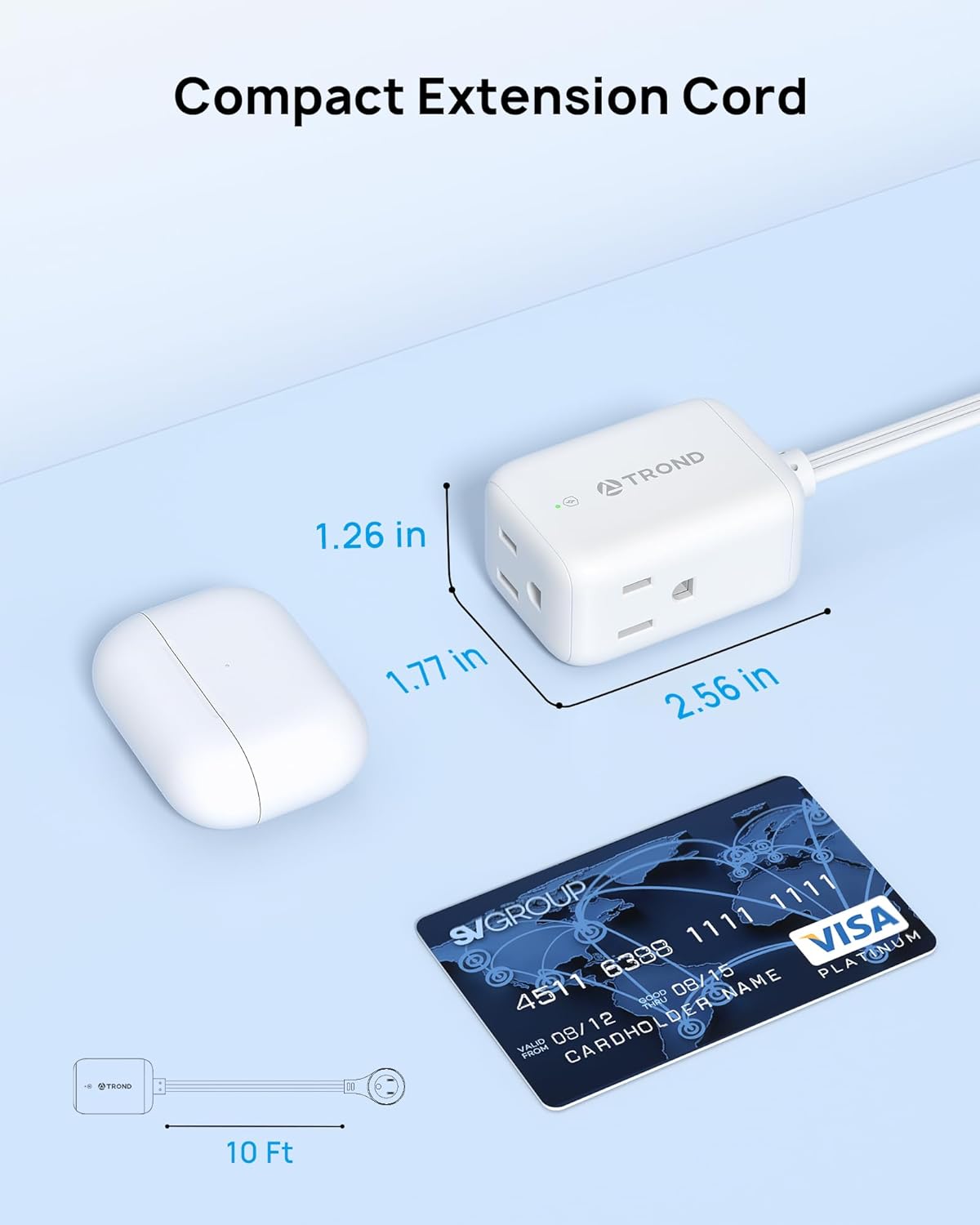 TROND 360° Rotating Flat Plug Extension Cord Surge Protector 10ft, Small Power Strip with 900 Joules, 3 Side Grounded Outlets, 13A, SPT 16/3 Gauge Wire, for Indoor Home Office Dorm Essentials, White