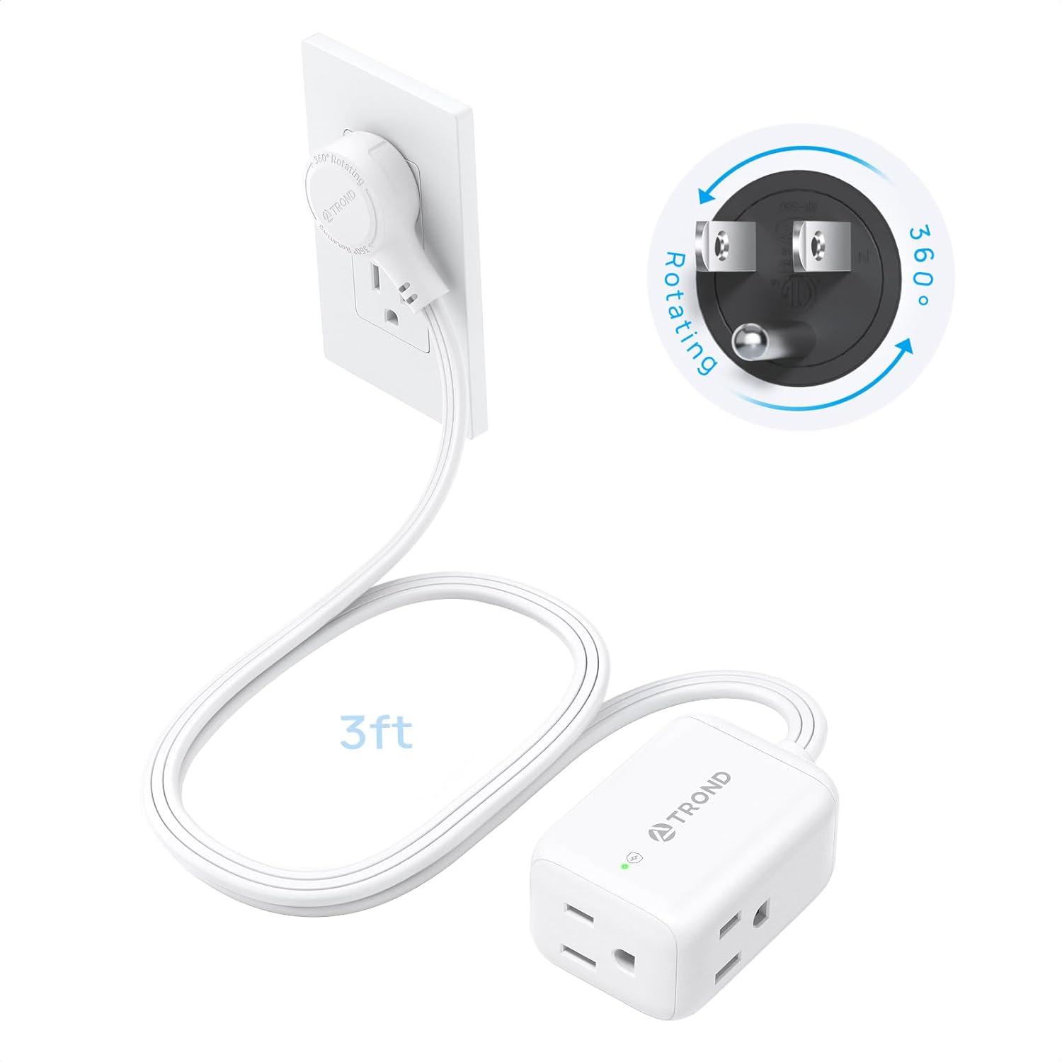 TROND 360° Rotating Flat Plug Extension Cord Surge Protector 3ft, Small Power Strip with 900 Joules, Three Side Grounded Outlets, 13A, 16 Gauge Wire, for Indoor Home Office Dorm Room Travel, White