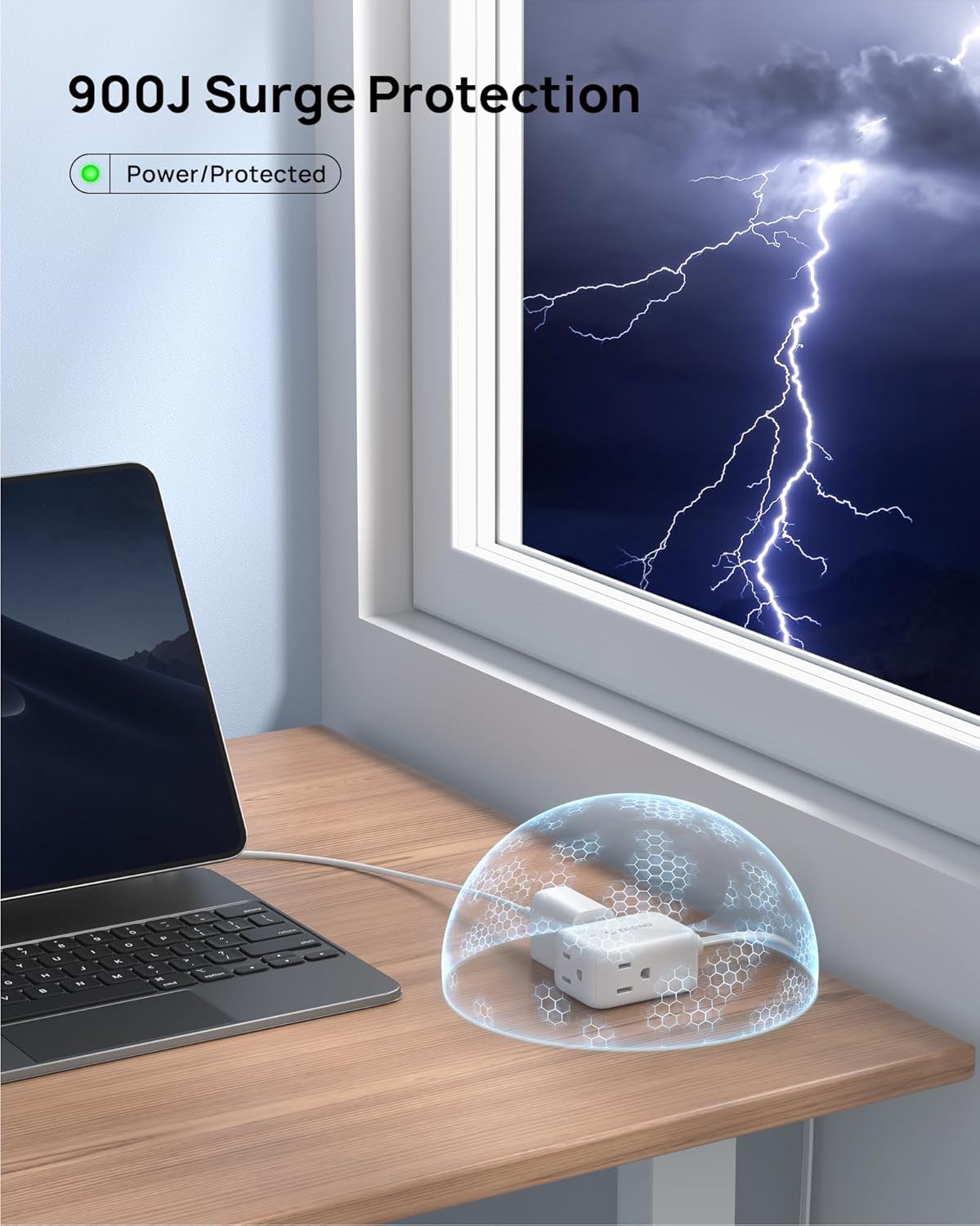 - Surge Protector Power Strip: With a robust 900 joules rating, it provides reliable protection for your computer, TV setup, or other home office electronics against power disturbances, including lightning, surges, and spikes. The green LED light indicates power and surge protection
