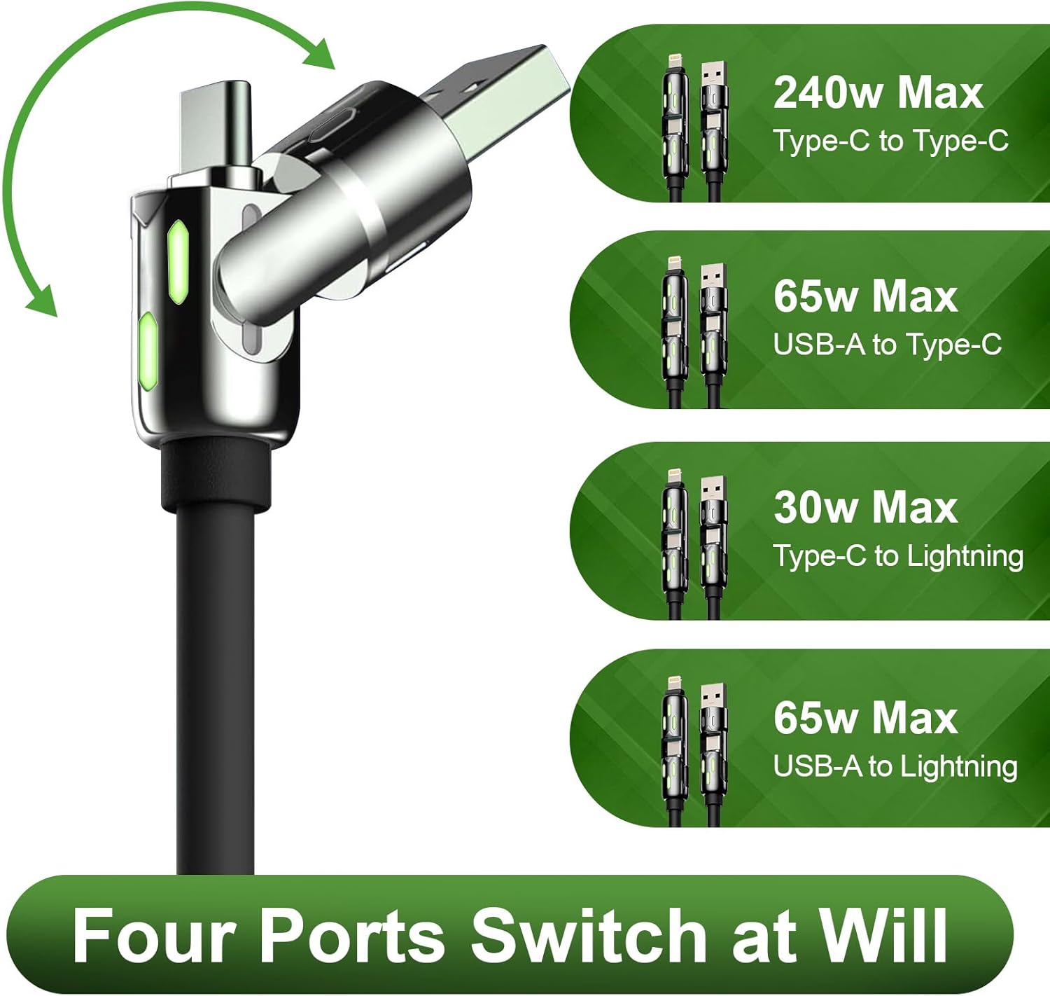 - Supports Power Delivery: The Dual Type-C connectors support up to 240W, USB-A to Type-C support up 65w Max, Type-C to Lightning support up 30w Max, USB-A to Lightning support up 65w Max. It automatically stops charging once the device is fully charged, preventing overcharging and battery damage. And RGB lights on both ports will keep changing colours when charging. It is a soft light, not flashing eyes, full of gaming atmosphere.