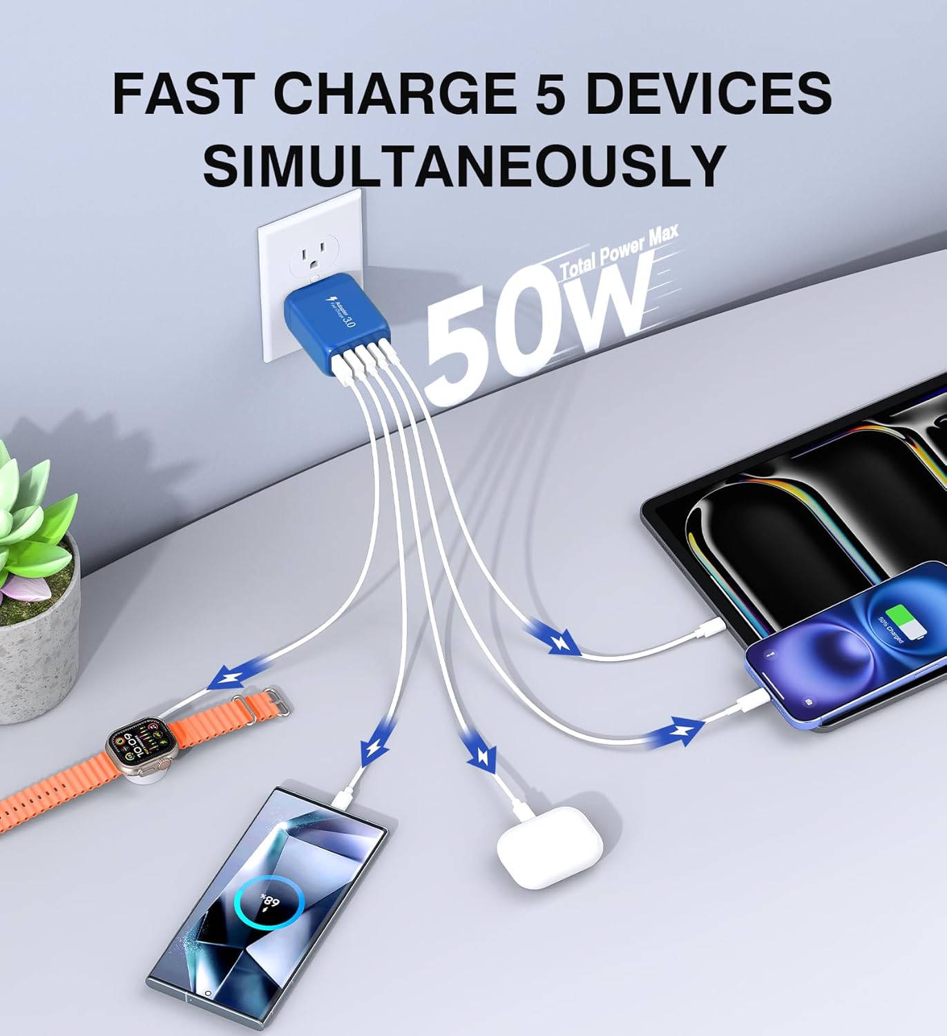 - 2-Pack 50W Fast Charging Block: 5-Port PD Fast USB C Charging Block featuring 2 USB-C ports and 3 USB-A ports for efficient charging. This usb charging block offers Power Delivery and Quick Charge 3.0 technology, delivering a total power output of up to 50W. The USB-A port provides 3.1A/5V output, while the USB-C port offers a rapid 20W charging speed. It can charge your iPhone 16/15 devices from 0% to 50% in just 30 minutes. Ideal for charging iPhone, iPad, MacBook, Samsung, tablets