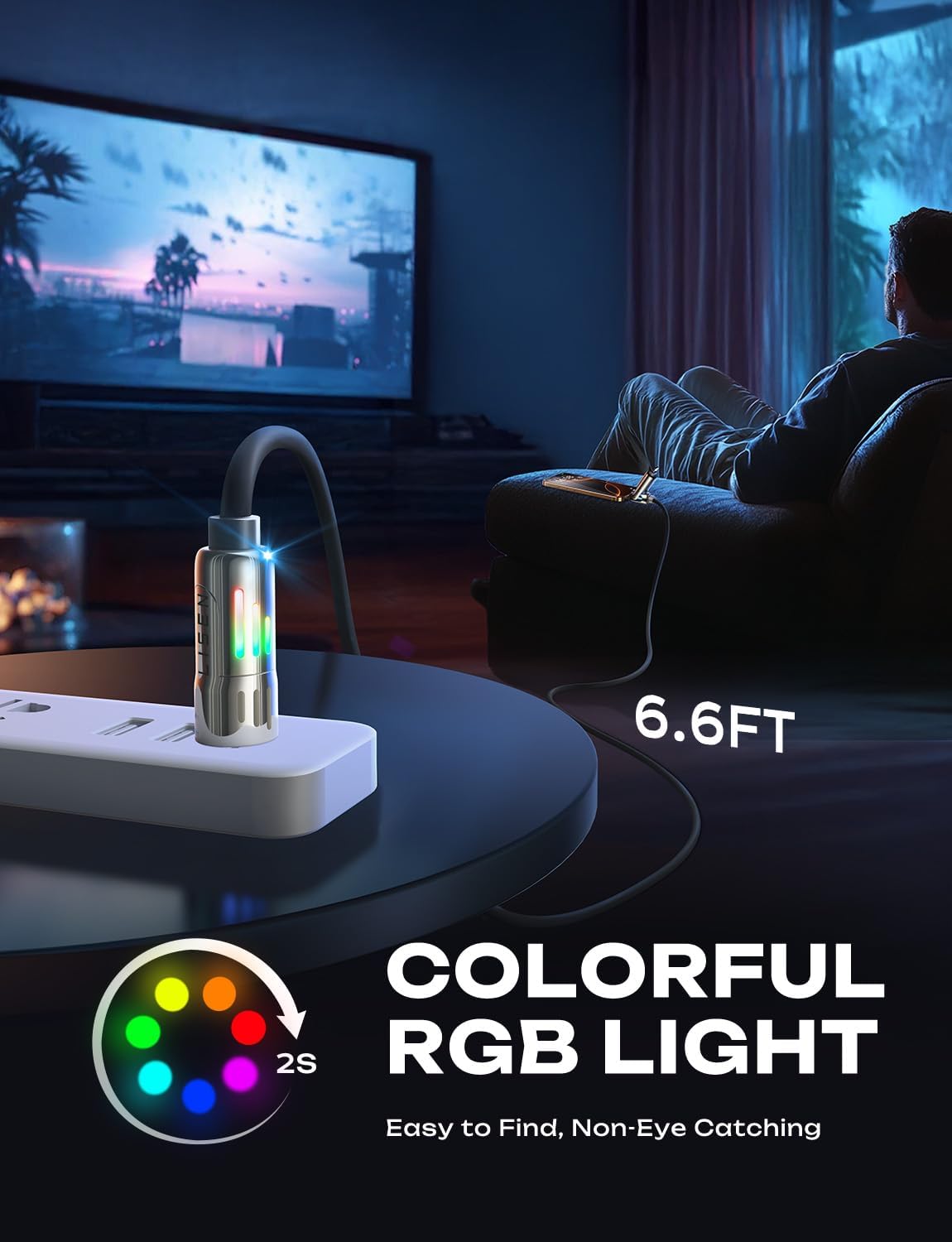 - [PD3.1 Emark Safe Chip & RGB light] The EMARK3.1 chip not only enables 240W fast charging but also maximizes device safety, ensuring 24-hour constant temperature charging. It automatically stops charging once the device is fully charged, preventing overcharging and battery damage. And RGB lights on both ports will keep changing colours when charging. It is a soft light, not flashing eyes, full of gaming atmosphere.