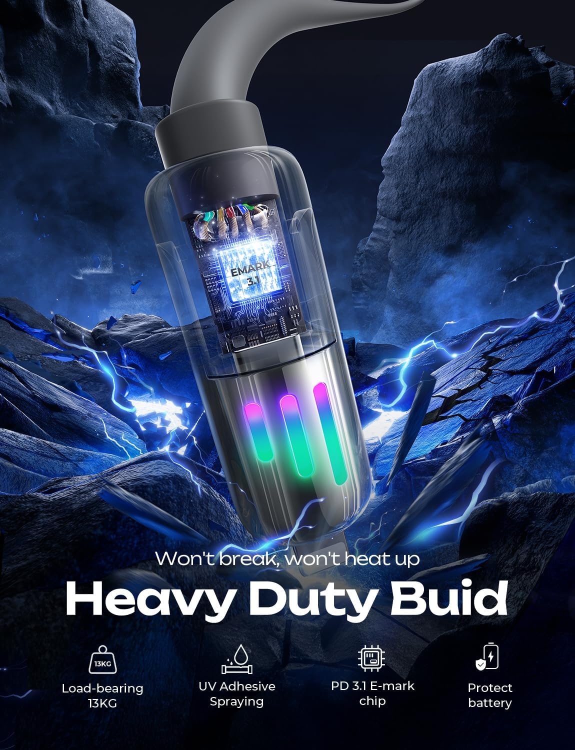 - [PD3.1 Emark Safe Chip & RGB light] The EMARK3.1 chip not only enables 240W fast charging but also maximizes device safety, ensuring 24-hour constant temperature charging. It automatically stops charging once the device is fully charged, preventing overcharging and battery damage. And RGB lights on both ports will keep changing colours when charging. It is a soft light, not flashing eyes, full of gaming atmosphere.