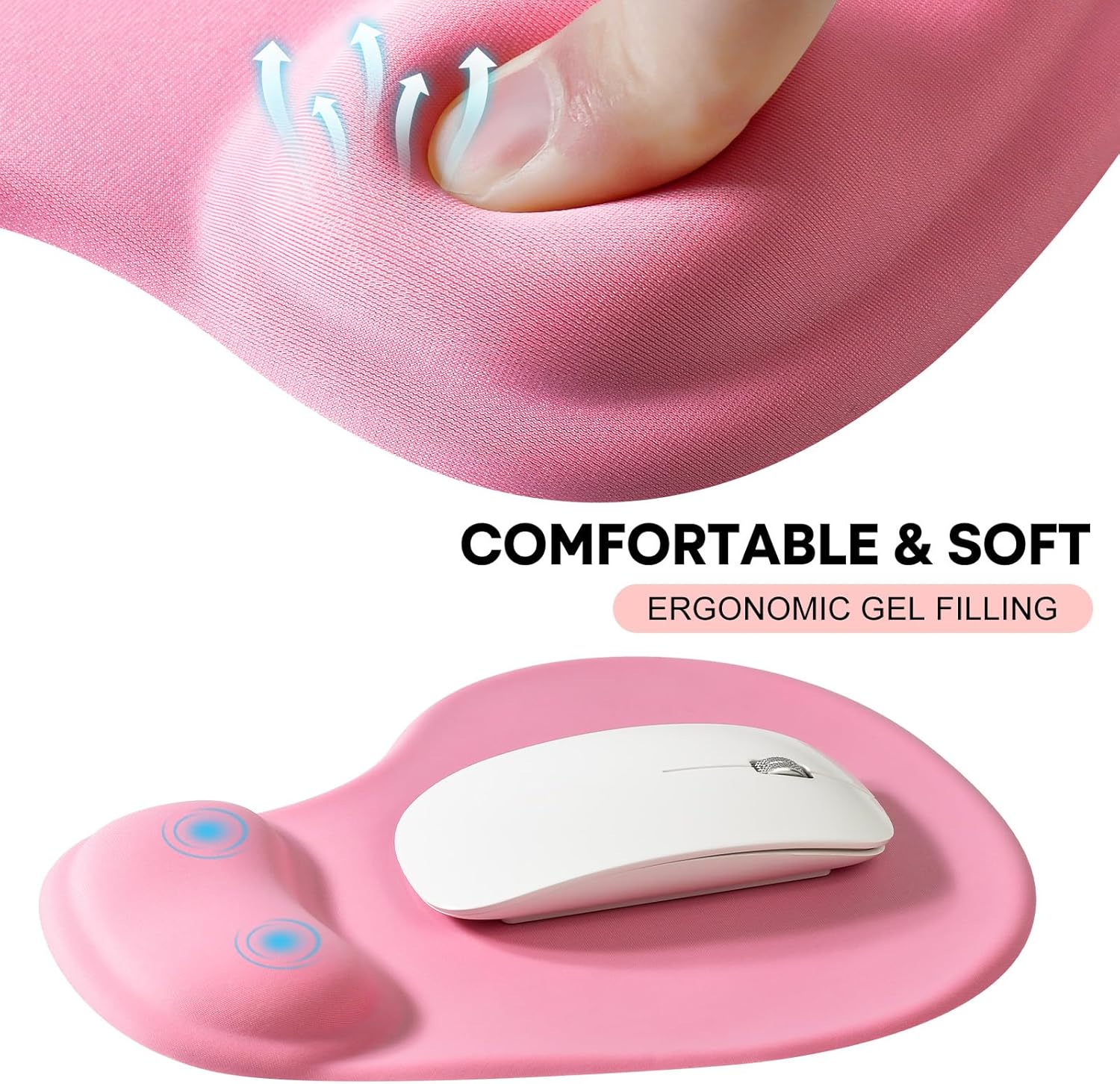 JIKIOU Mouse Pad, 2 Pack Ergonomic Mouse Pads with Comfortable Gel Wrist Rest Support and Smooth Cloth, Non-Slip PU Base for Easy Typing Pain Relief Durable and Easy to Clean Small Pink