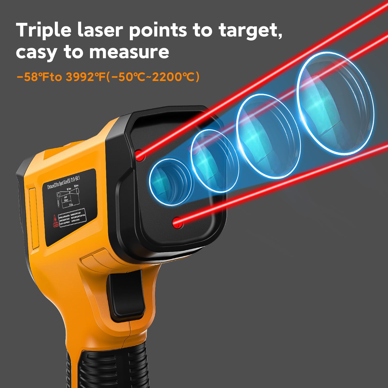 - Triple-Laser Precision Targeting: Equipped with a triple-laser aiming system to ensure precise targeting, combined with a 50:1 high distance-to-spot ratio and a rapid 0.5-second response time, enabling efficient and accurate temperature measurements.