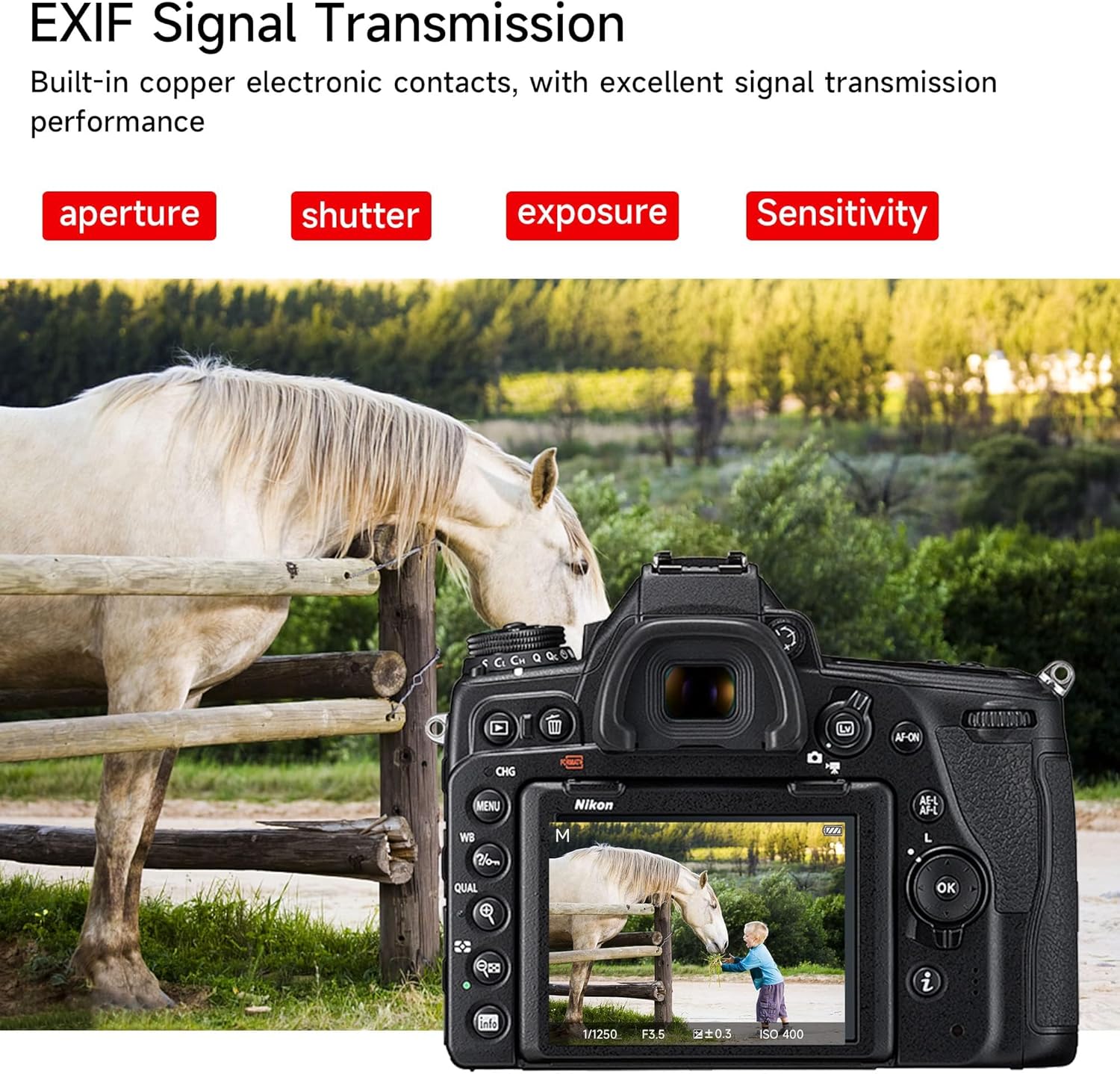 - EXIF Signal to Transmit & IS Function: Cooper gold-plated contacts with great conductivity enhance the EXIF info. Transmission between lens and camera body. Built-in IS function, making your focus much more precise and clear.