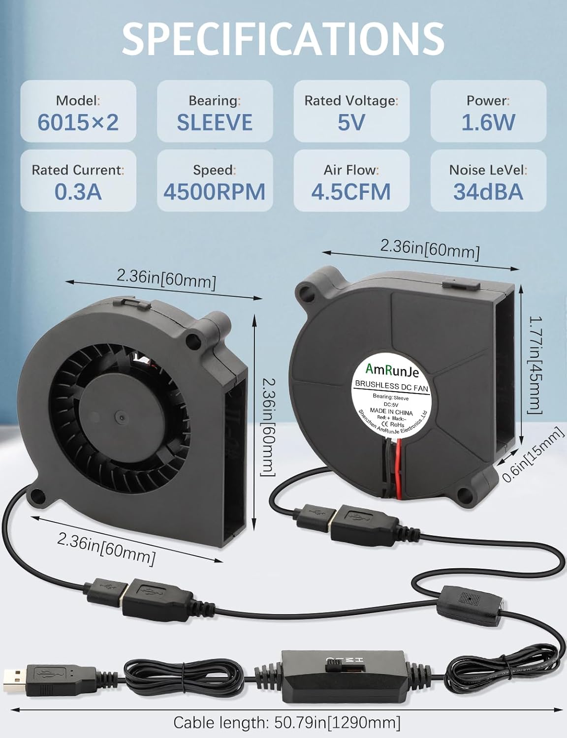 - Usb-A Power Cord: With a single USB control cable for both fans, these turbine fans are user-friendly, offering a USB connection. They draw power from a variety of sources including phone chargers, computers, routers, and power banks