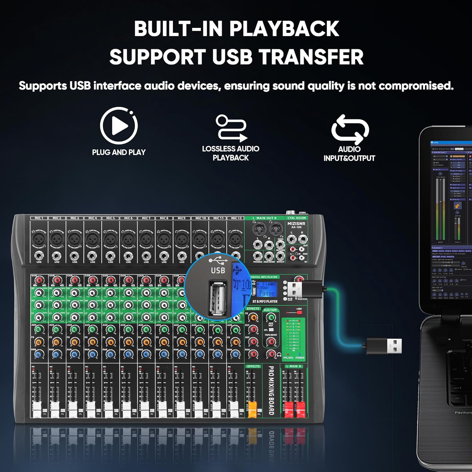 - Seamless Bluetooth Playback: Enjoy hassle-free connectivity with built-in Bluetooth functionality. Link your mobile phone, tablet to the audio interface effortlessly. Equipped with MP3/U disk direct input, a built-in MP3 player and recorder, and support for MP3, WAV, and WMA formats, this mixer ensures flexible playback options. Easily record and edit audio via USB with high-definition LCD feedback for full control. (Note: Cannot connect to Macbook for recording.)