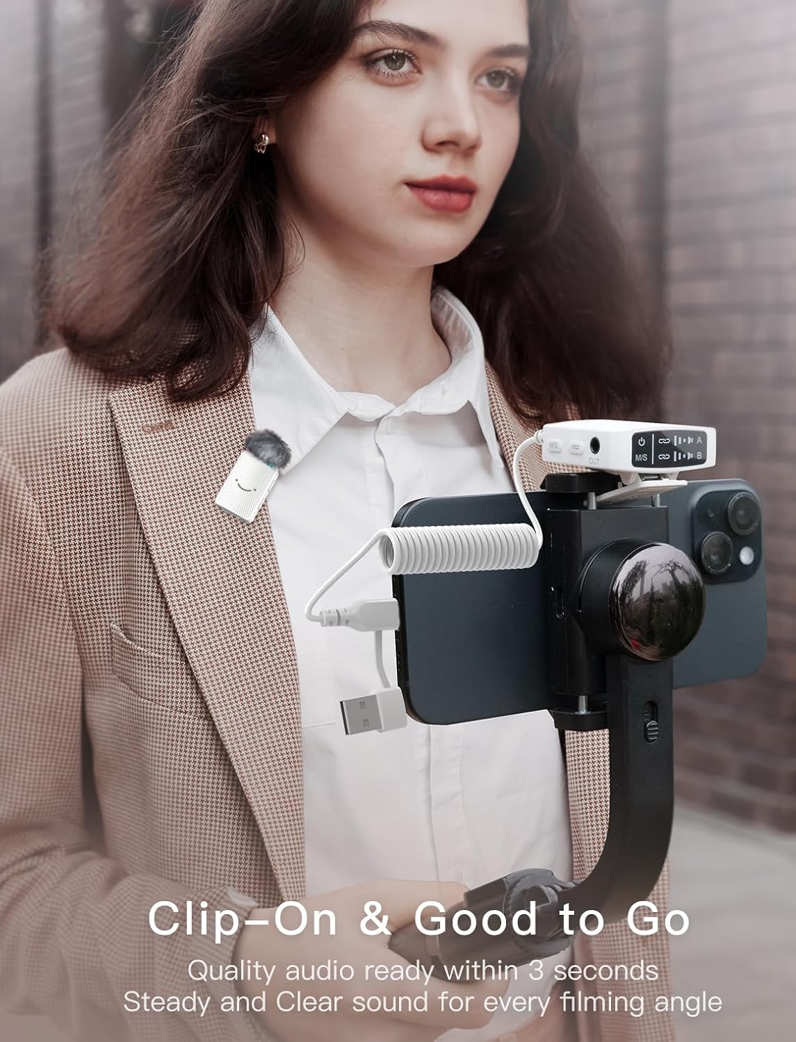 - [Versatile Compatibility, One-Stop Solution] Whether you're shooting on a DSLR, vlogging on a Type-C smartphone, or online course recording on a laptop, the wireless lapel mic for podcast is convenient to connect to Android phones, tablets, iPhones, iPads, and laptops. Clip microphone wireless is ideal choice for creators who switch between platforms or need flexibility in different recording environments.