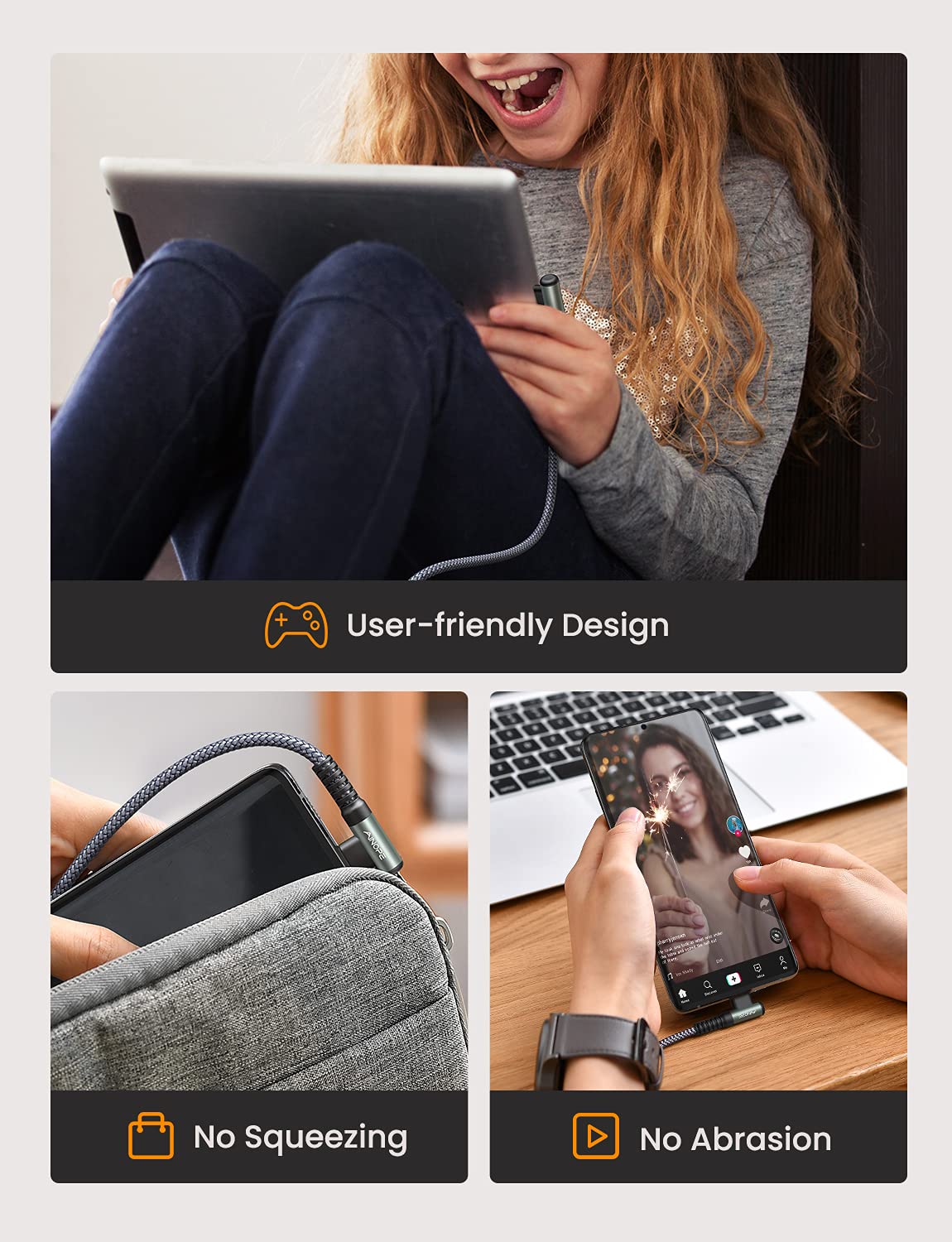 - [Upgraded Exclusive Right Angle Design] This right angle type c charging cable fast charge with an innovative 90 degrees " L " design. It's user-friendly design more convenient and comfortable for playing games, watching videos, reading e-books when you charging. γ NOTE: The thickness of the compatible mobile phone case charging port is 5.5mm.γ