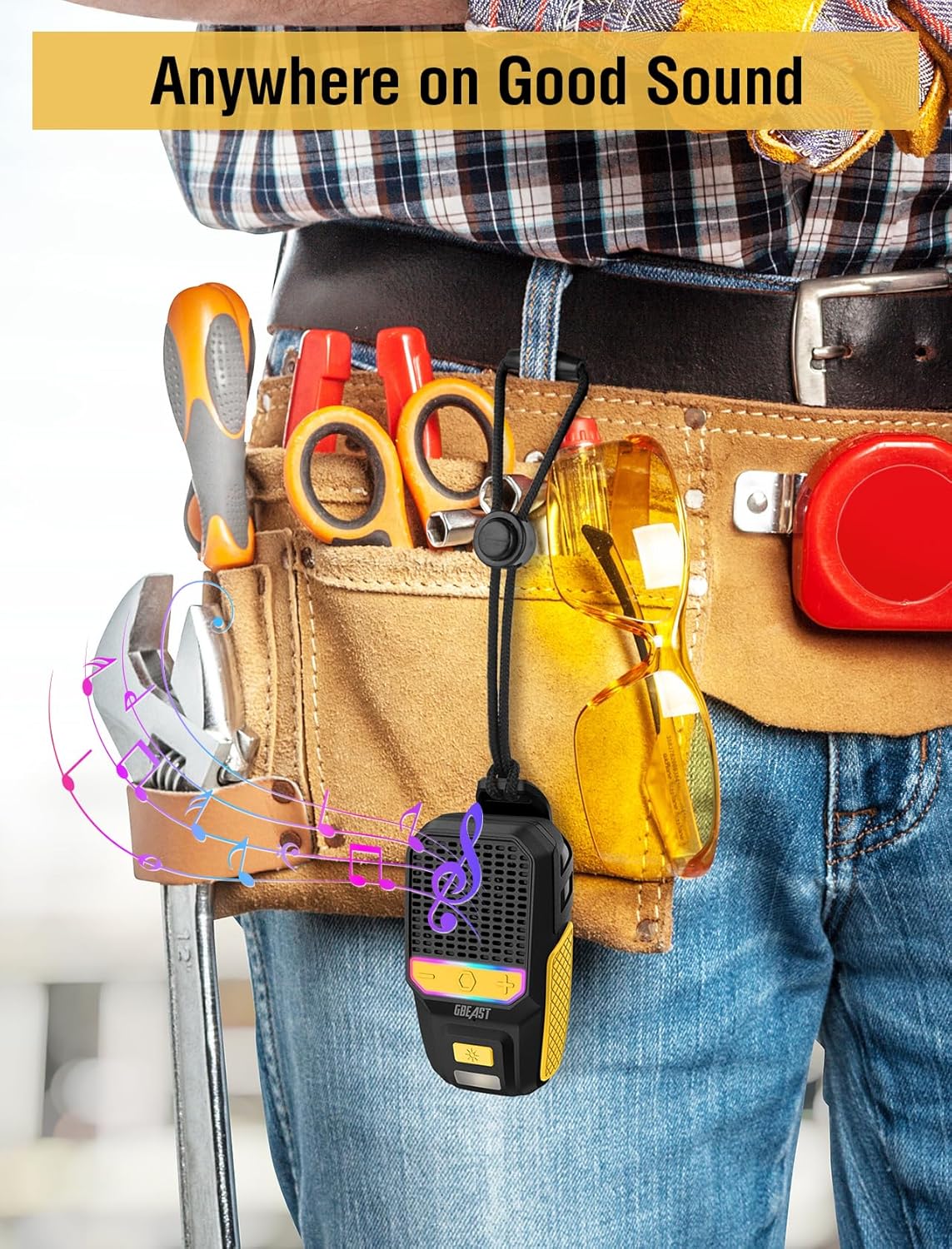 - 【Hands-Free Calls & Music】 GBEAST wearable bluetooth speaker built-in ENC noise-canceling mics for clear calls. It can via clip/lanyard (included) wear to tool belts/clothes collar/backpacks/bike handlebars with one-handed operation. Bluetooth 5.4 + 85% stereo music give you a 360° depth experience when you call or play music.