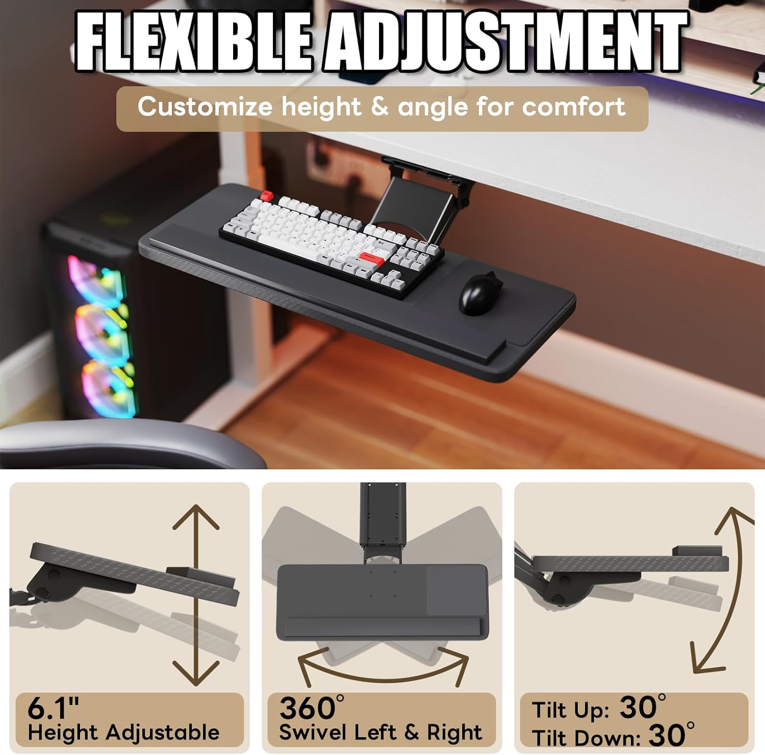 - Ergonomic Typing Enhances Comfort: Customize your typing position with our flexible adjustable keyboard tray, featuring 6.3″ height adjustment range, 180° swivel, and +6°/-22° tilt. Whether you prefer to work sitting or standing, this flexibility ensures a more comfortable typing experience.