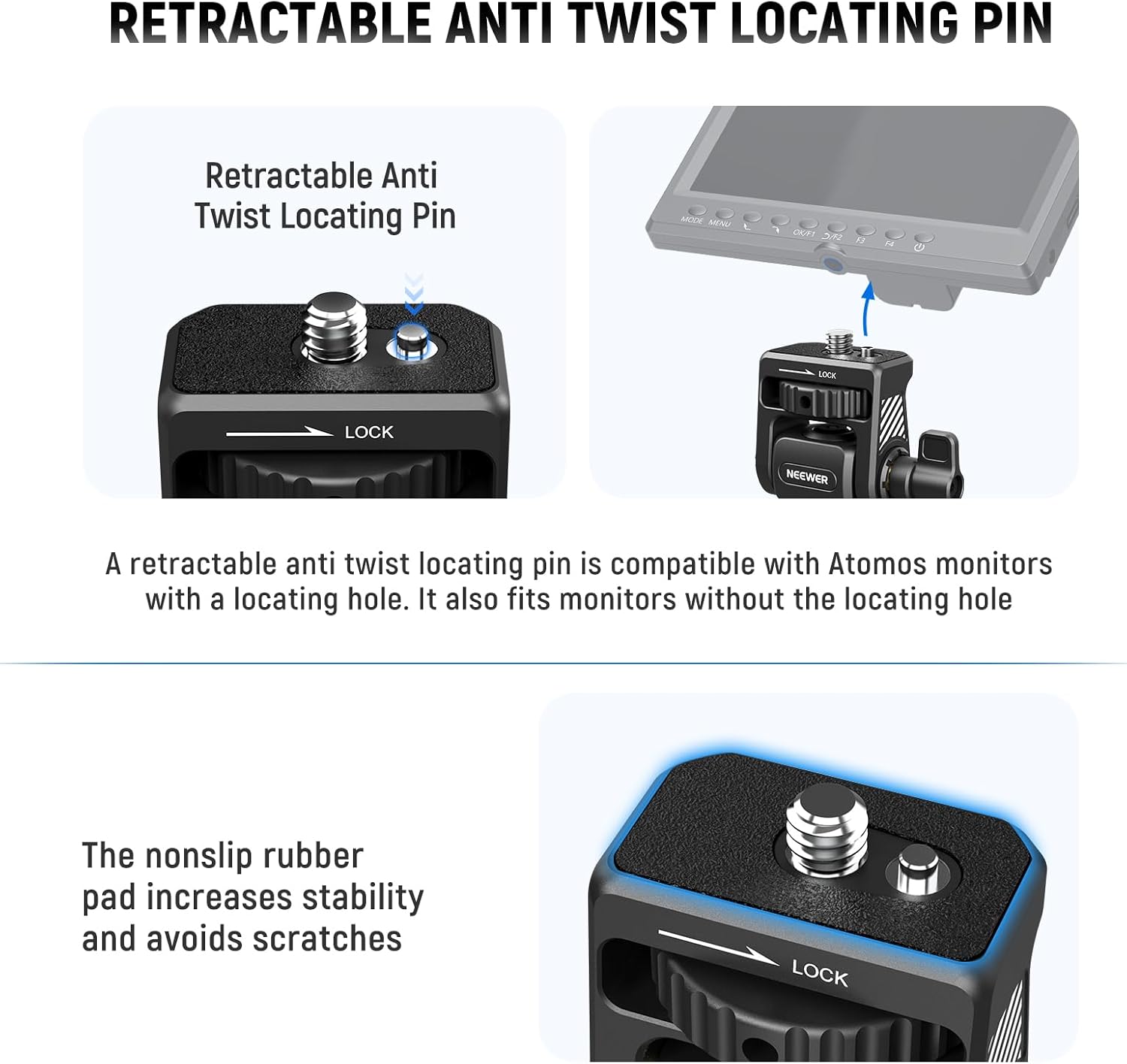 - 【Retractable Anti Twist Locating Pin】 A retractable anti twist locating pin is compatible with Atomos Ninja V Ninja V+ and other monitors with a locating hole, or NEEWER F100 F200 F400 Pro F500 monitors without a locating hole. The nonslip rubber pad adds stability and prevents scratches