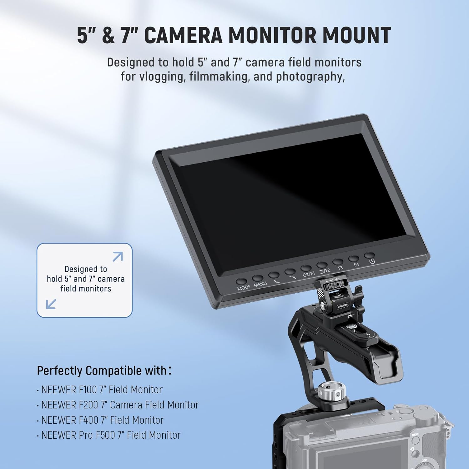 - 【For 5" & 7" Camera Field Monitors】 Designed for 5" and 7" camera field monitors, this monitor mount with a NATO clamp is compatible with SmallRig and NEEWER camera cages compatible with Canon Sony Nikon Fujifilm Fuji cameras, video rigs, top handle accessories, side handles, gimbal sling handles, and camera hot shoes, perfect for vlogging, filmmaking, and photography
