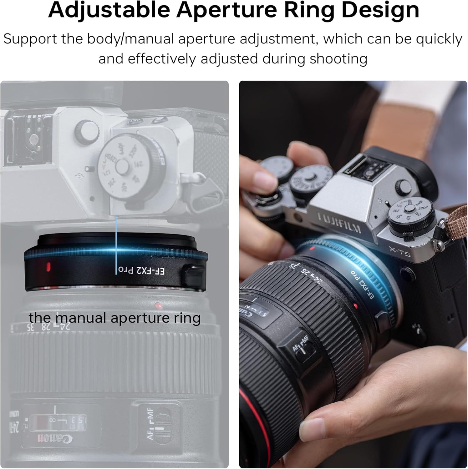 - Auto Focus Function & Aperture Control: With copper electronic contacts, EF-FX2 Pro will give you a fast speed and a smooth focusing experience. You can also adjust the aperture of the EF lens by controlling the Fuji X-Mount mirrorless camera body.