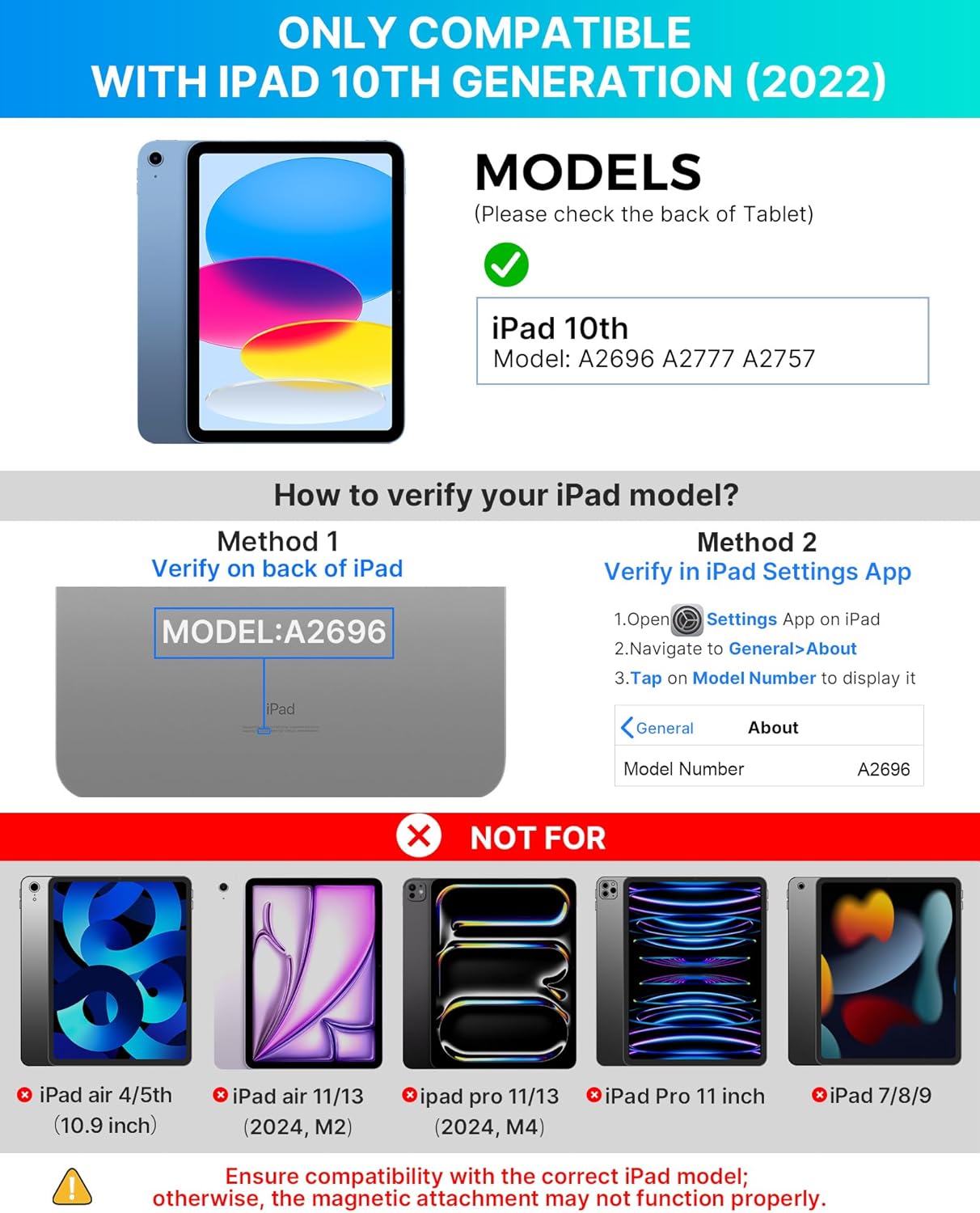 - Compatibility: This keyboard case, designed specifically for 10th-generation iPad models (10.9-inch, 2022) A2696, A2757, A2777, ensures a perfect fit by checking your iPad's model number on the back, starting with 'A.'