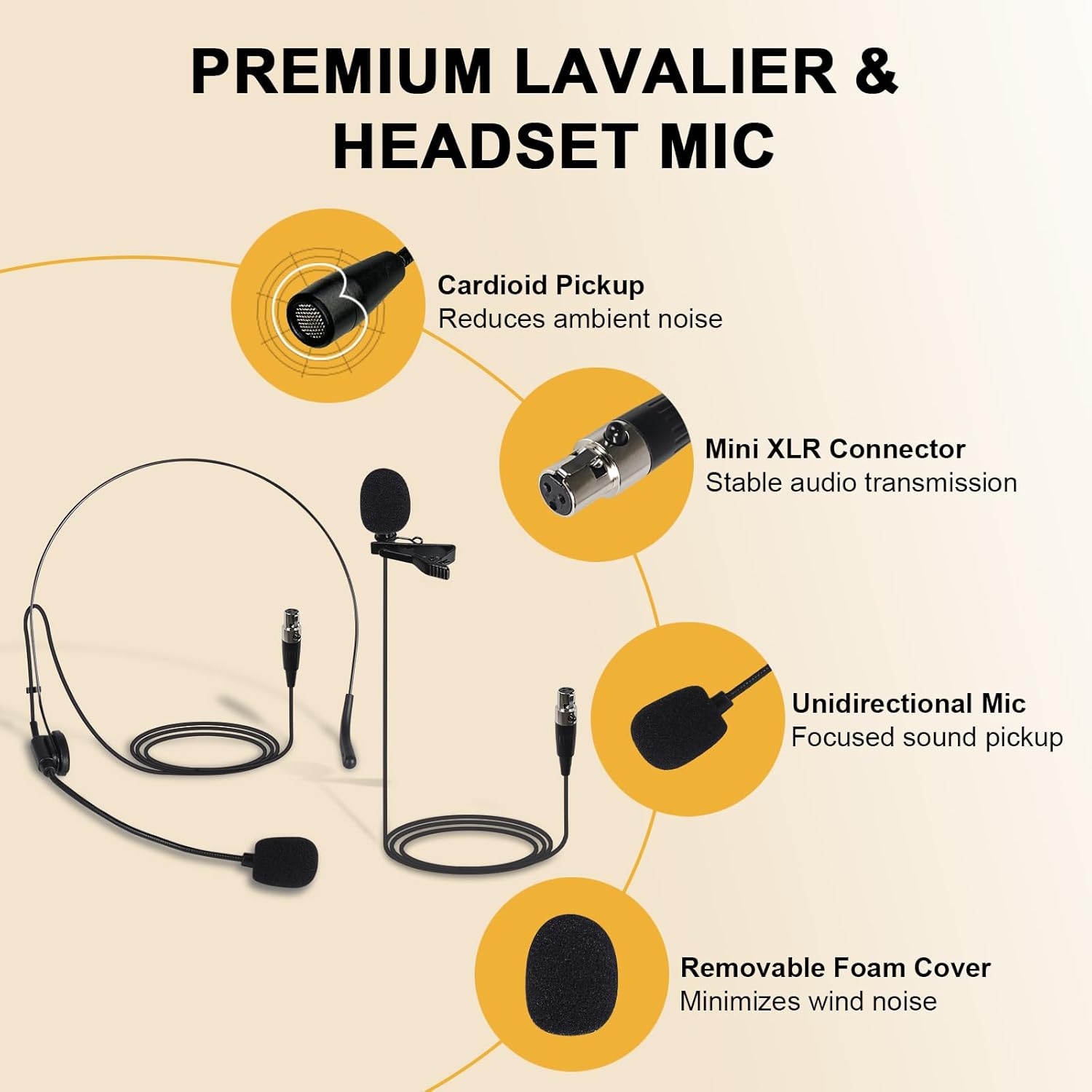 - SEAMLESS WIRELESS CONNECTIVITY: Benefit from expansive 200ft coverage with UHF 500MHz signal clarity, the lavalier and headset microfono possess an excellent wireless performance. With frequency hopping, our wireless microphone enables the selection of clear frequencies free from interference, ensuring smooth wireless transmission even in complex scences. Meanwhile, its 4x10 frequency groups support the simultaneous use of up to 8 systems, providing added convenience for extensive setups