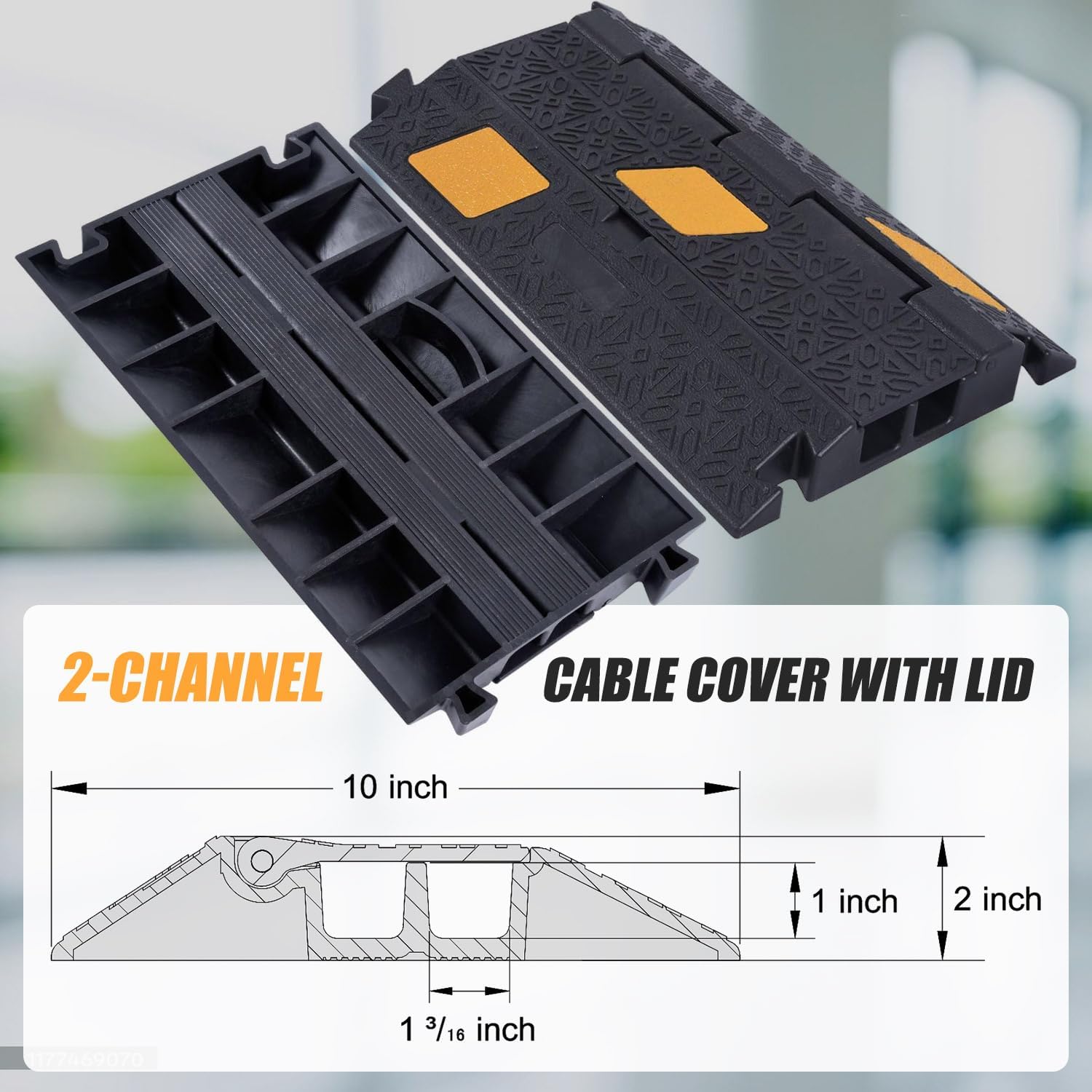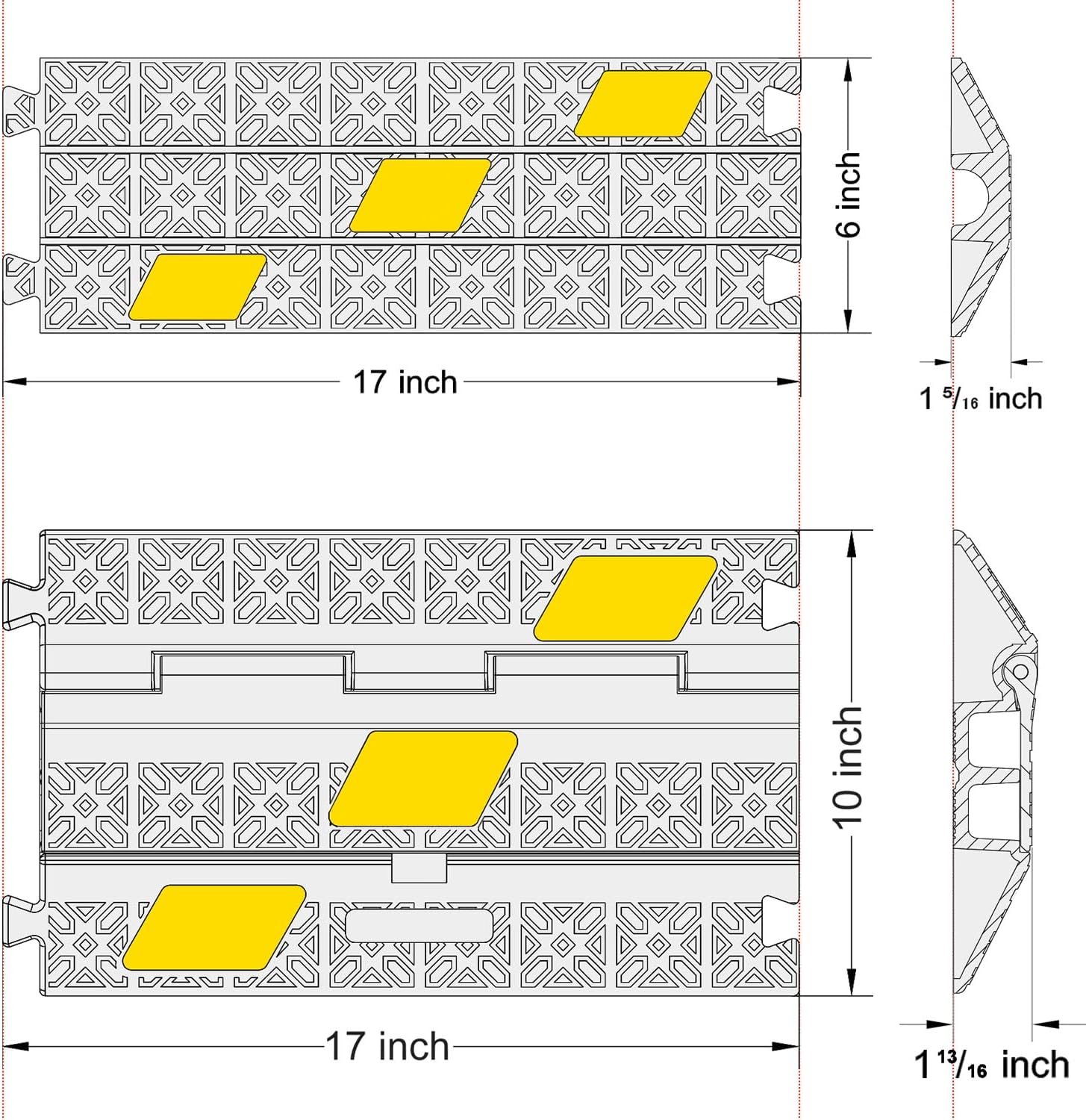 - Interlocking Cable Protector Ramp --- 1-Channel & 2-Channel Floor Cable Cover Size 17"x10"x1.8" inch, 1-Channel Floor Cable Ramp Size 17"x6"x1.3" inch, can be interlocked end-to-end to increase service length