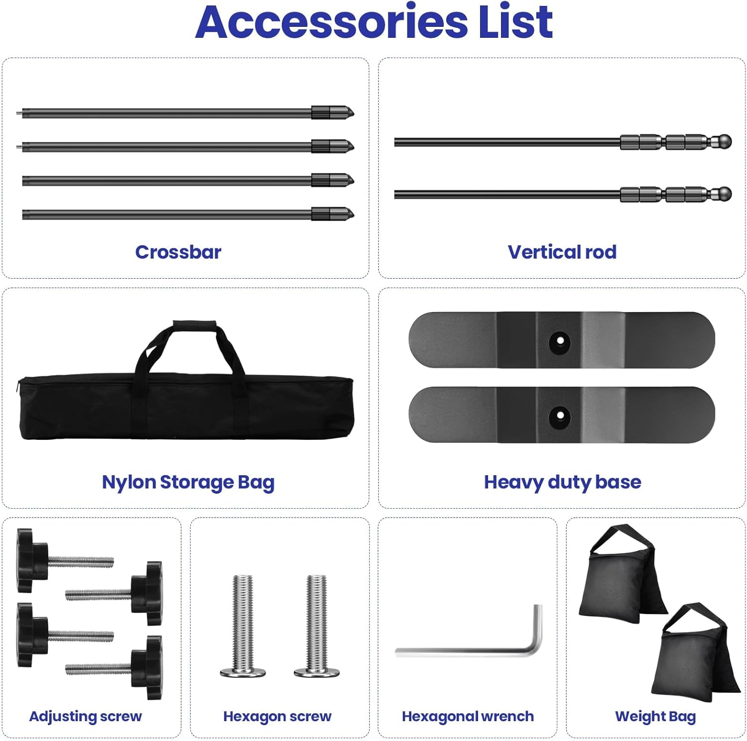 - 【Package includes】: (2) x Heavy Duty Base, (2) x 8ft Adjustable Vertical Tube, (4) x 5ft Adjustable Horizontal Tube, (2) x Screws, (1) x Hex Key Wrench, (2) x Sandbag, (1) x Carry Bag.