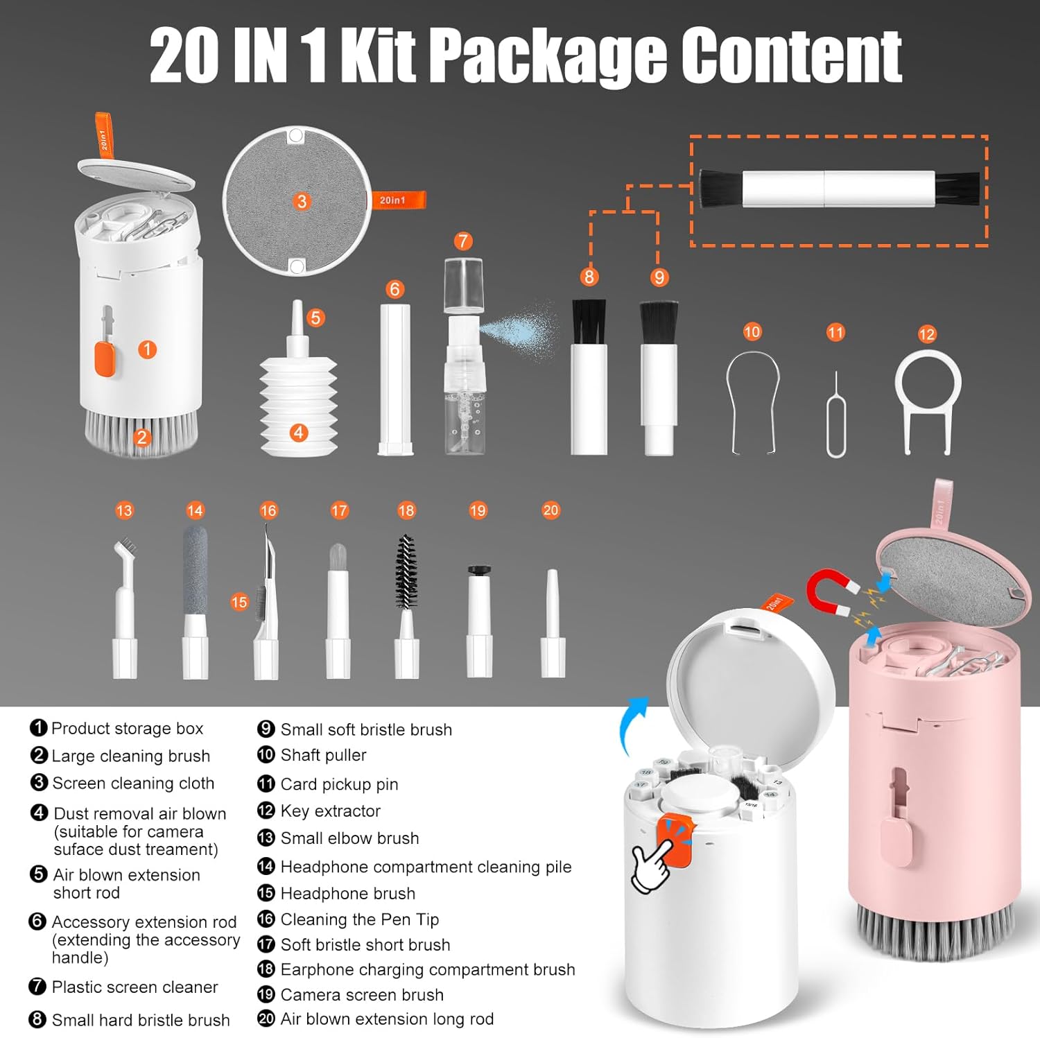 - 2 Pack 20 in 1 Keyboard Screen Cleaner Kit: One of computer cleaning kit includes an Airpod cleaner pen, flocking sponge, mini soft brush, len brush, earphone case cleaning brush, and camera brush (All these brushes with the help of an extension rod which could use easier), screen cleaner spray, microfiber fiber cloth of the lid, retractable keyboard brush, keycap puller, shaft puller, air blower with 2 rods for extending, dual head brush (hard and soft bristle brush), card pickup pin.