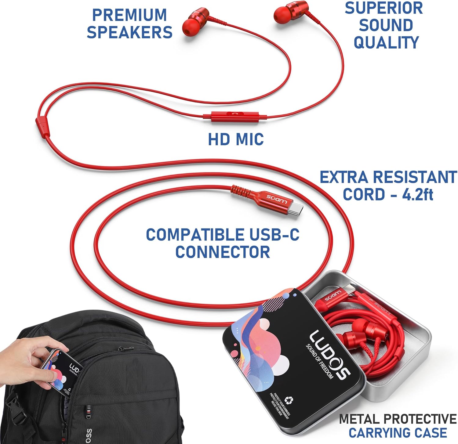 LUDOS OMNITONE USB C Headphones for iPhone 16 15 Pro Max Plus iPad Pro, 5 Years Warranty, USB-C Earbuds for Samsung Galaxy S24 S23 Ultra S22 S21 S20 A55 A54 A53, USB Type C Earphones - Red