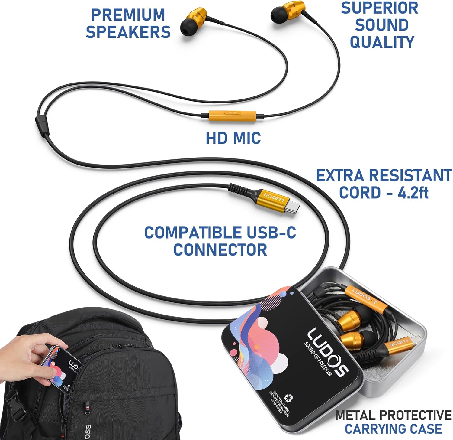 LUDOS OMNITONE USB C Headphones for iPhone 16 15 Pro Max Plus iPad Pro, 5 Years Warranty, USB-C Earbuds for Samsung Galaxy S24 S23 Ultra S22 S21 S20 A55 A54 A53, USB Type C Earphones - Gold