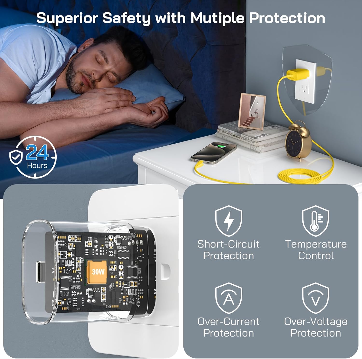 - 【Mutiple safeguards, Assured Safety Fast Charging】30 watt USB C wall charger has passed the UL standard certification and has built-in multiple protection systems to avoid overvoltage, overcharge, overheating and overcurrent. Equipped with upgraded intelligent IC identification technology, i Pad air charger fast charging kit automatically matches your device's charging mode and current for fast, safe and stable charging of your i Phone15 and i Pad.