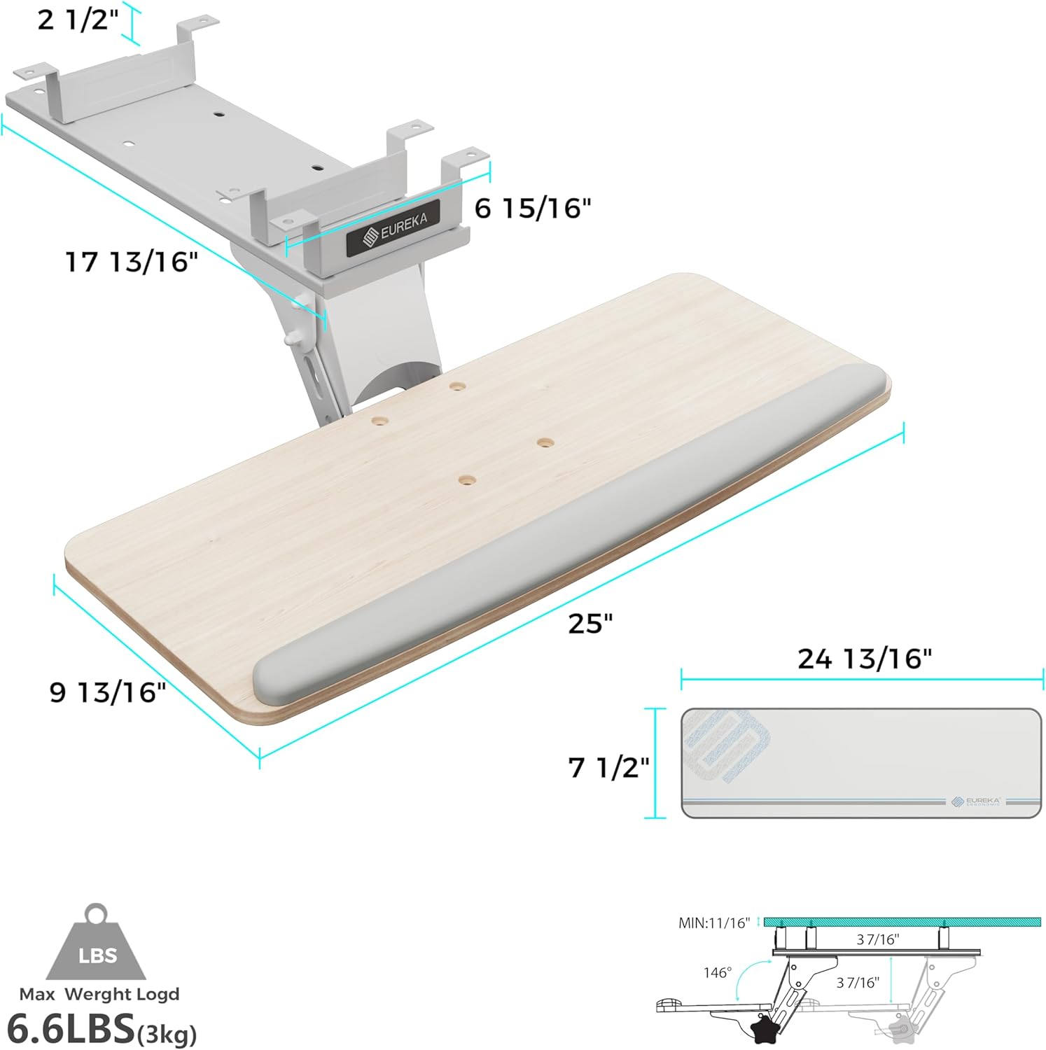 - Durable Support & Stable Mechanism: The one-piece swivel keyboard tray is designed with a stable mechanical structure made of durable materials. With a weight capacity of 6.6 LBS, the keyboard platform tray holds the keyboard and mouse firmly in place and can provide smooth support for typing/gaming. The ergonomic keyboard tray comes with a detailed manual for easy installation and use.
