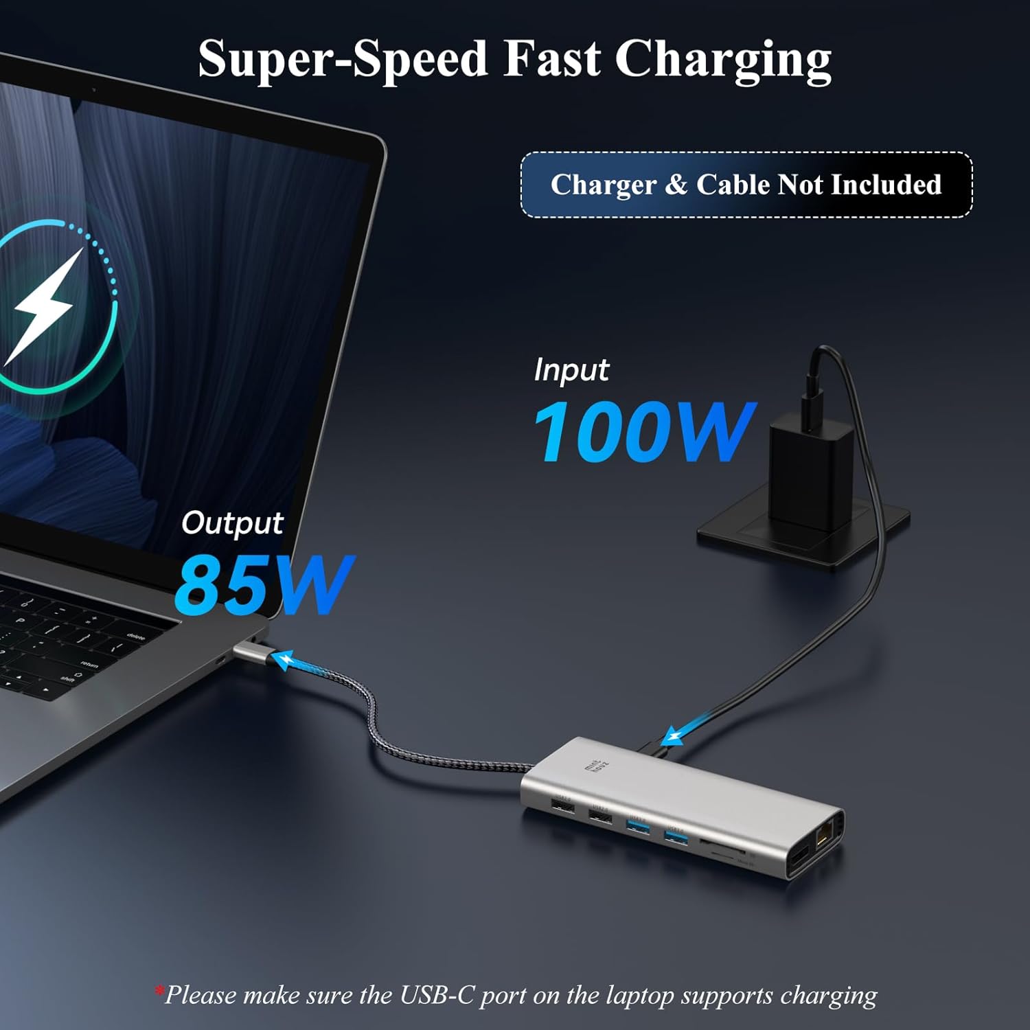 - ★ Laptop Dock Fast 85W PD Charging: USB C Dock 100W Power Delivery pass-through charging Compatible with USB-C Power Delivery to provide high-speed pass-through charging up to 85W. Please note: 100W PD wall charger and USB C Docking cable required, Connect your laptop's original or compatible Type-C power adapter to the dock macbook air docking station to deliver up to 85W power to your laptop while powering peripherals. ( "Power Adapter Required")