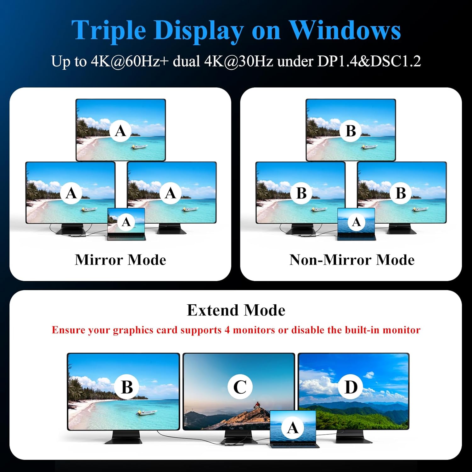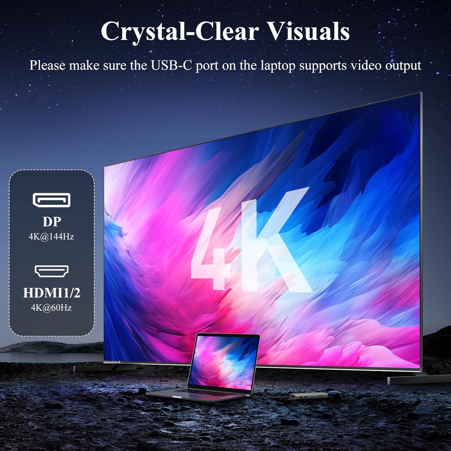- ★ USD C Docking Station Dual Monitor: usbc dongle docking station dual monitor for visual creators and gamers, usb c docking station delivers ultra HD images with triple 4K (under DP1.4 & DSC1.2) through HDMI and DP1/DP2 ports,Ensure your laptop's USB-C port supports video output. This computer docking station for laptops dual monitor for laptop will help you easily to achieve docking station 3 monitors, make your work/life more efficient