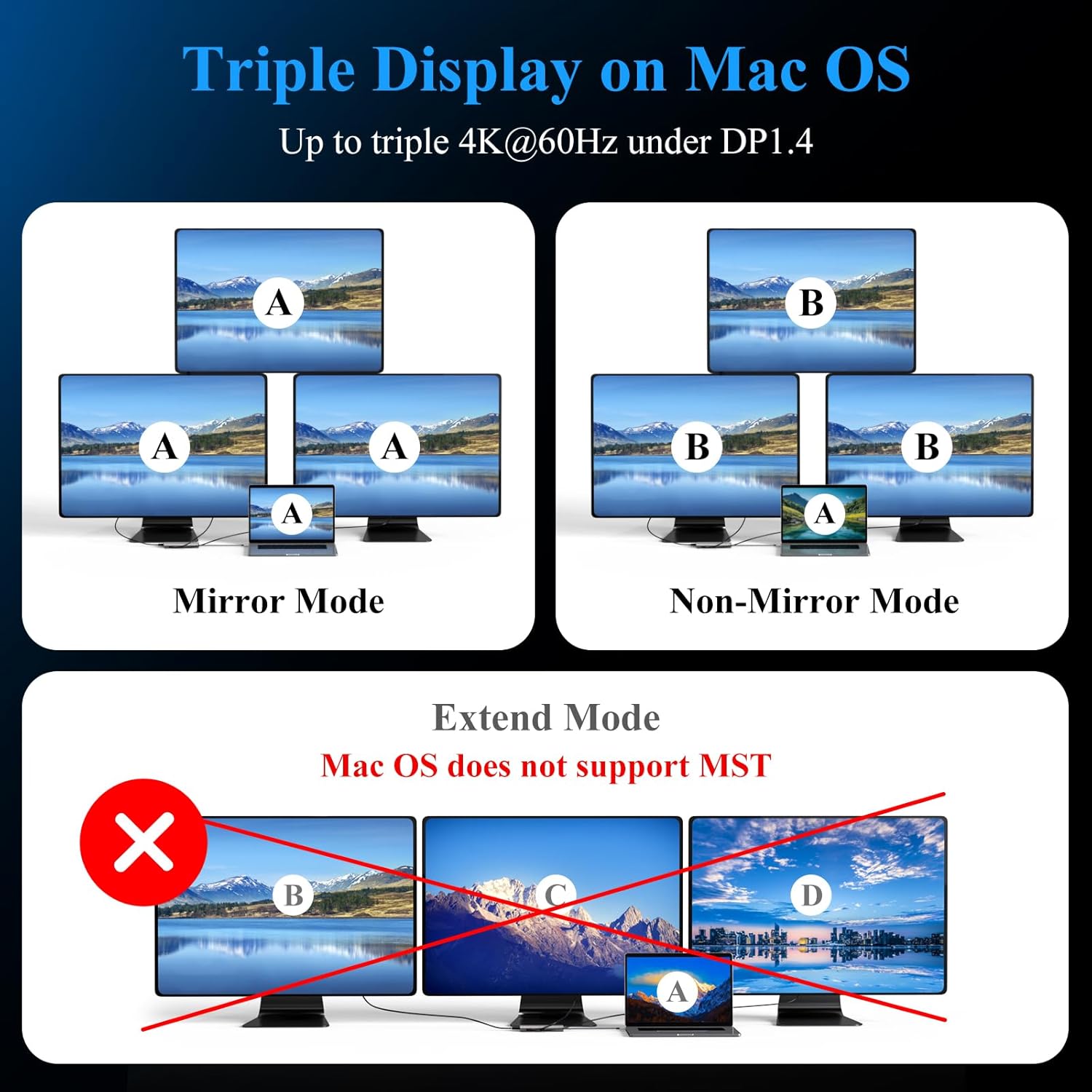 - ★ Computer Docking Station 12-In-1 : USB C Dock docking station 3 monitors with 4K@144Hz DP, 4K@60Hz HDMI *2, USB-C PD 100W In, 2x 5Gbps USBa 3.0, 2x USB 2.0, Gigabit Ethernet, SD/TF slots, and a 2-in-1 Audio/Mic laptop docking station dual monitor,Note: Multi-Stream Transport (MST) is not supported on Mac laptops. Displays connected via HDMI/DP/VGA (if those video ports are available) will mirror the same imagea