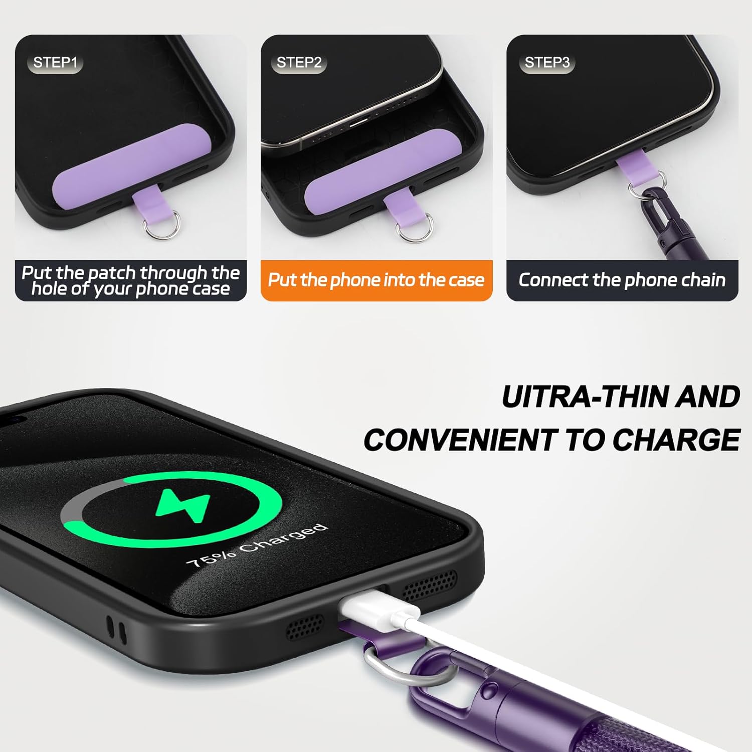 - 【Not Blockcharging Port】: The phone tether tab is very thin and light and the universal cell phone chain does not block your charging hole,Compatible for both corded and wireless charging without being removed.