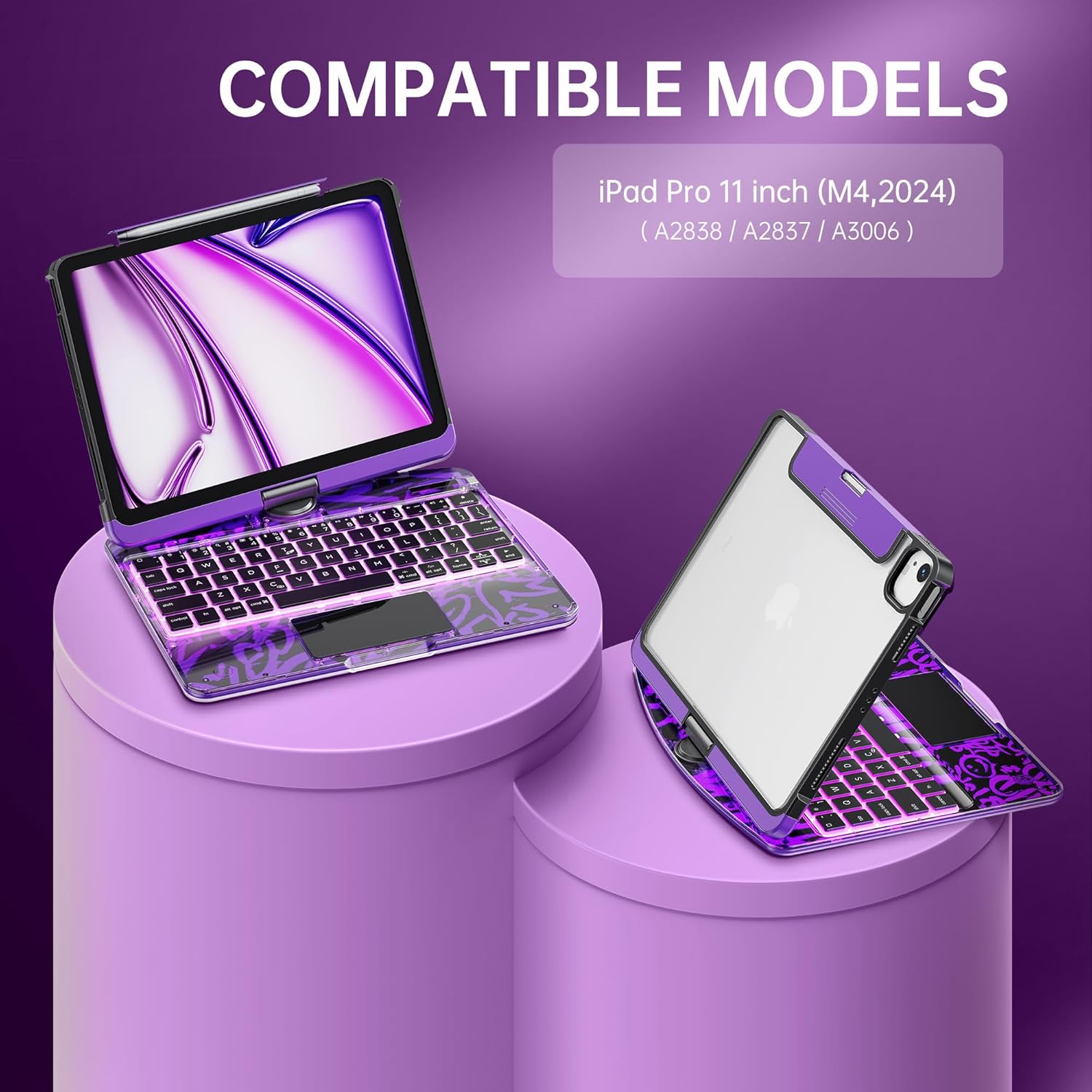 GUSGU Transparent Case with Wireless Keyboard only for 2024 iPad Pro 11-in.(M4), 7 Colors Backlight, Trackpad, 360°Rotating Stand for iPad Pro 11(5th Gen), Tech Style
