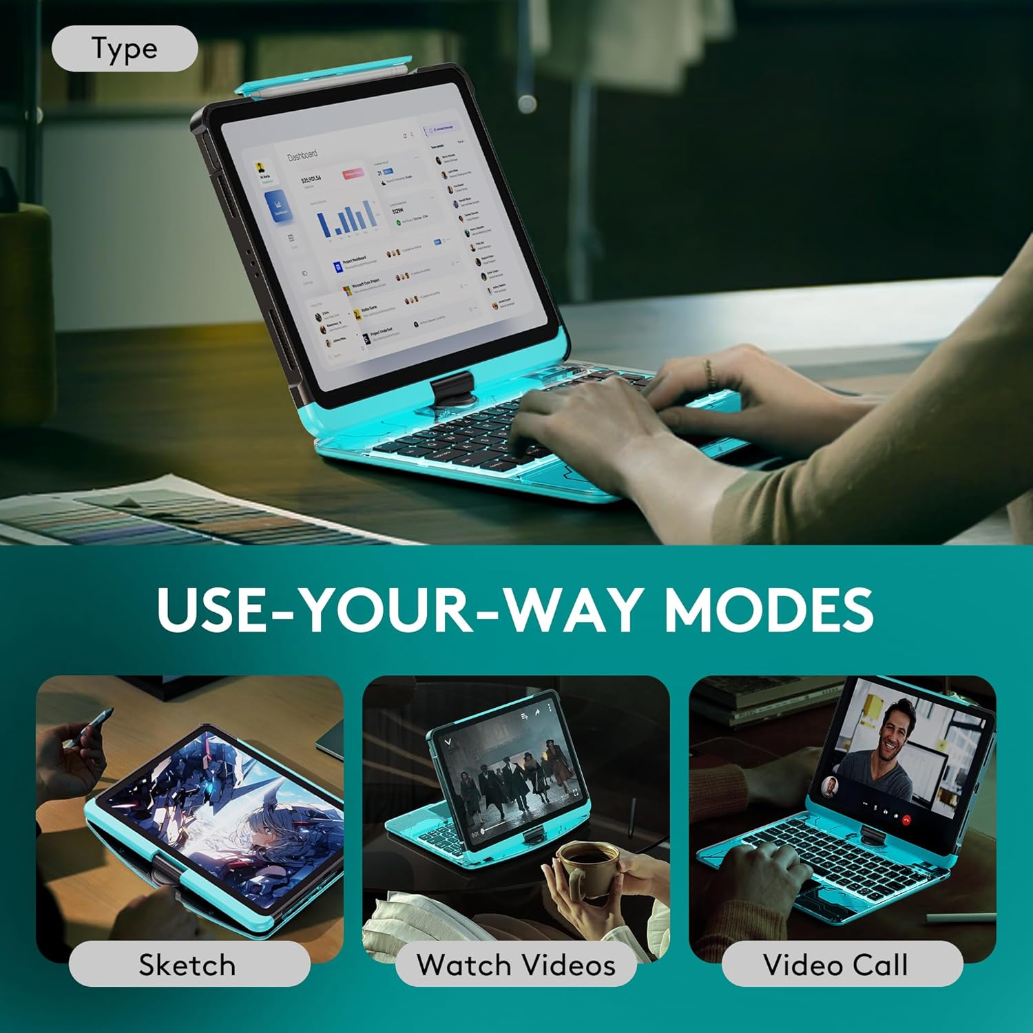 - 360° Rotating Stand & Multi-Angle Viewing: Enjoy full flexibility with the 360° swivel stand, offering 5 adjustable viewing angles. Whether you're typing, sketching, or watching a movie, seamlessly shift your iPad for maximum comfort and productivity in any mode.