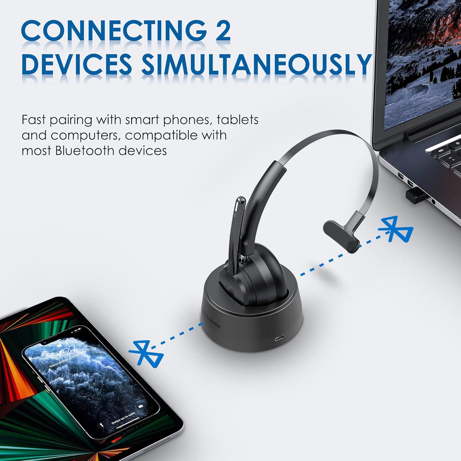- 【BLUETOOTH 5.0 UNIVERSAL COMPATIBLE】The Mopchnic wireless headset adapts the latest Bluetooth version 5.0, which provides more stable connection and it’s compatible with cell phones, laptops, computers and other Bluetooth devices. You can use the USB dongle to connect to devices that don’t have Bluetooth capabilities